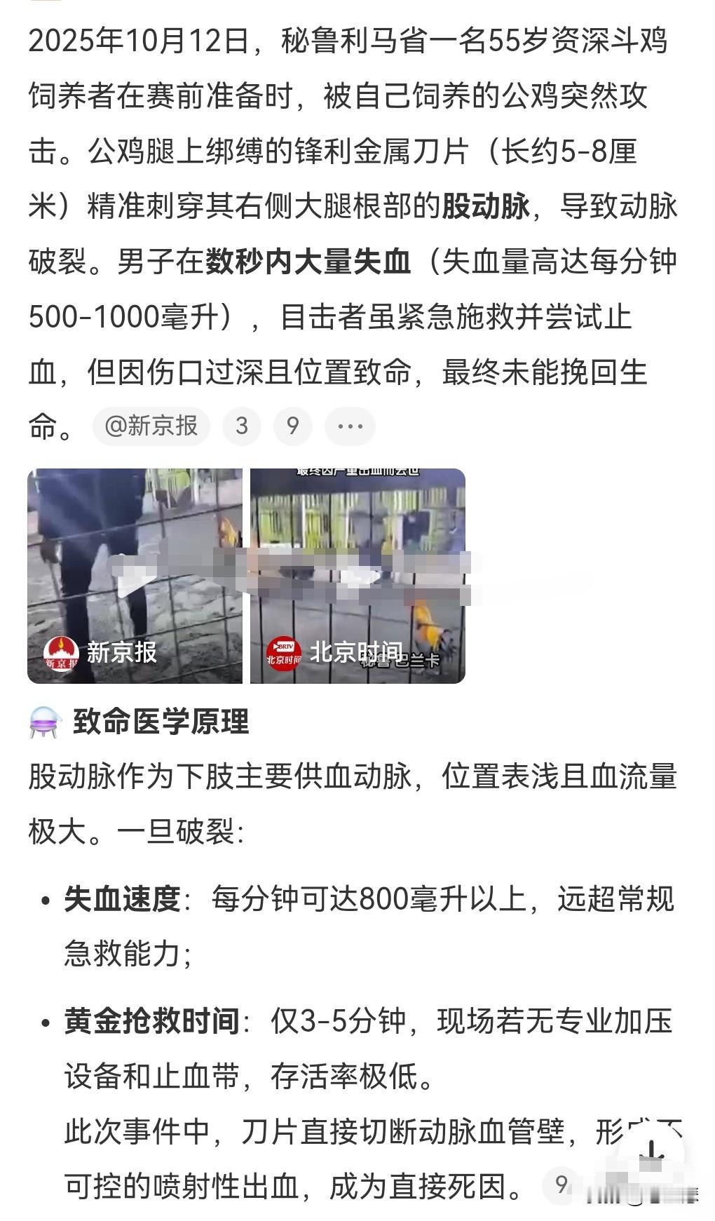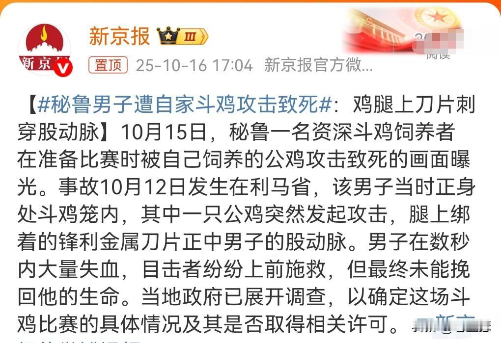 看到斗鸡这种残忍的行为真的该好好的停止了。 秘鲁的斗鸡太残忍了。 竟然会在鸡的腿上绑上锋利的刀片。 10月15日,秘鲁男子遭自家斗鸡攻击致死,公鸡身上的刀片锋利的划破了他的股动脉。 造成失血严重,最终死亡。 这真是防不胜防。 这种斗鸡的形式跟的真的该禁止。