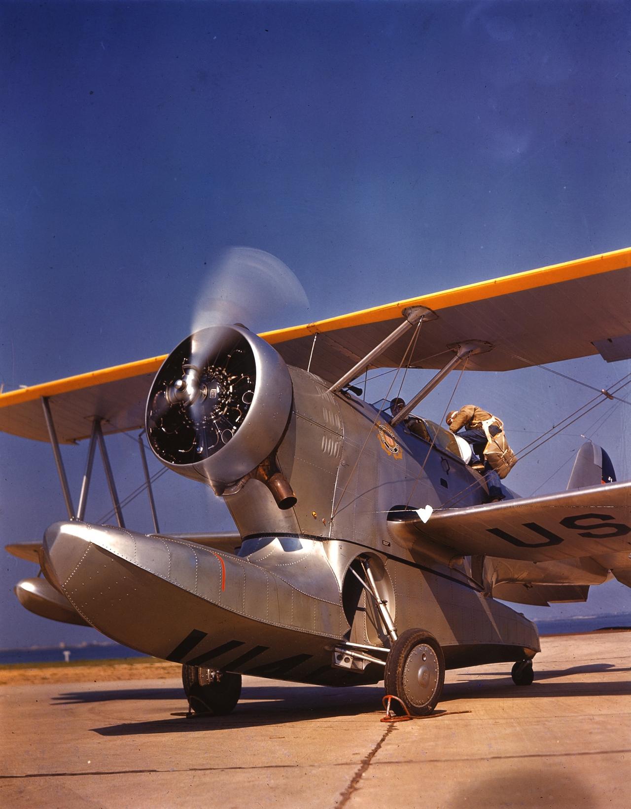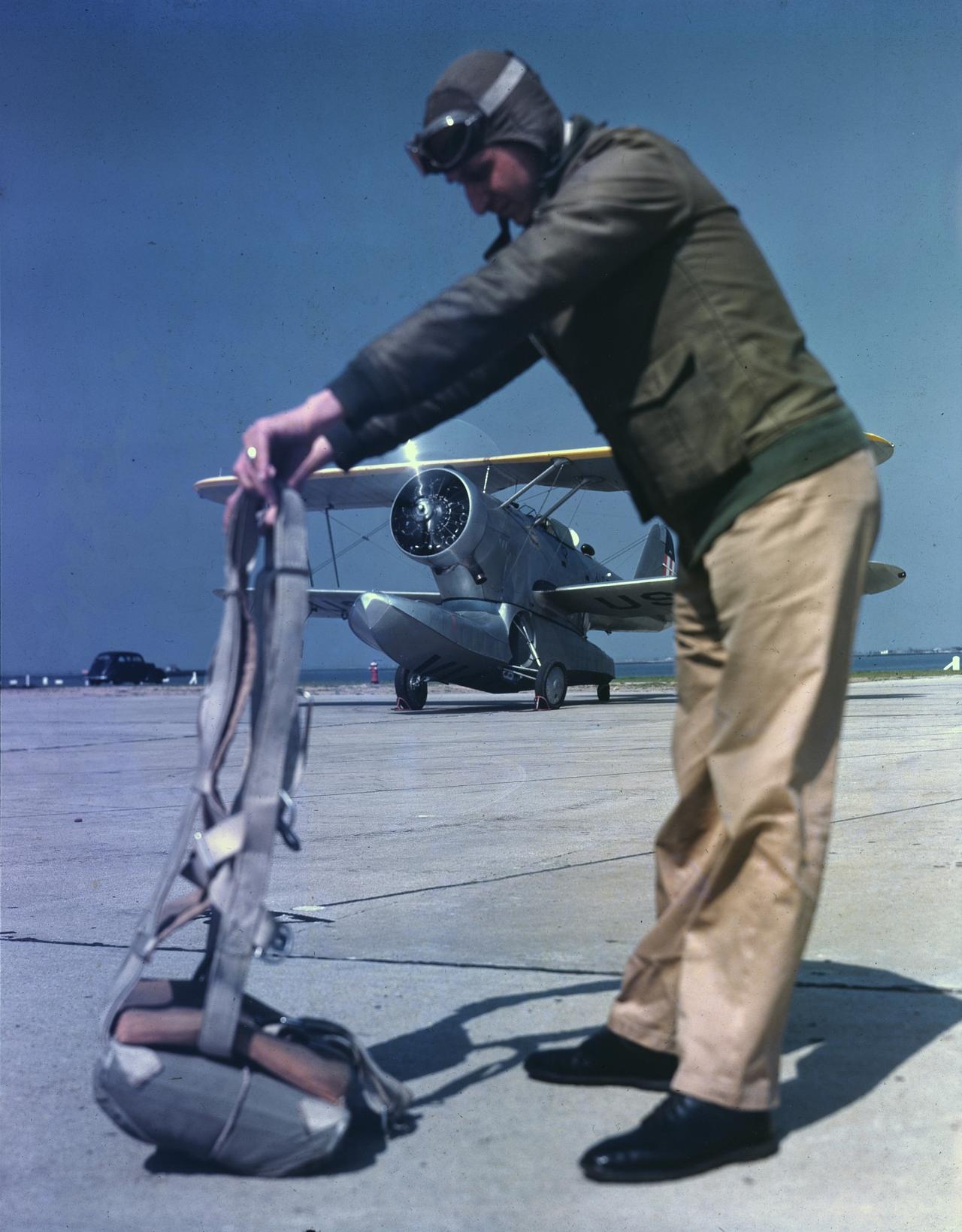 1940年,纽约,弗洛伊德·贝内特机场。一位美国海岸警卫队飞行员正在整理降落伞,背景是一架格鲁曼JF-2“鸭子”两栖飞机。 弗洛伊德·贝内特机场是纽约市的第一个市政机场,在历史上曾作为军事基地使用。在二战时期,它是一个重要的航空活动中心。 格鲁曼JF-2“鸭子”两栖飞机(参见图2~4)是美国格鲁曼公司设计制造的第一种两栖飞机,因其机体下方安装的船式浮筒前端形似鸭头而得名。它既能在陆地机场起降,也能在水面操作,在二战期间主要用于反潜巡逻、海岸巡逻、海空搜救等任务。 美国海岸警卫队是美国的武装部队之一,负责海上巡逻、搜救等。
