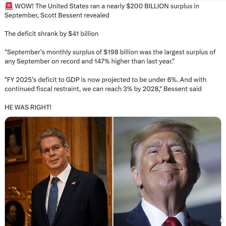 美国财长斯科特·贝森特透露,美国在9月份实现了近2000亿美元的预算盈余,赤字缩减了410亿美元。
