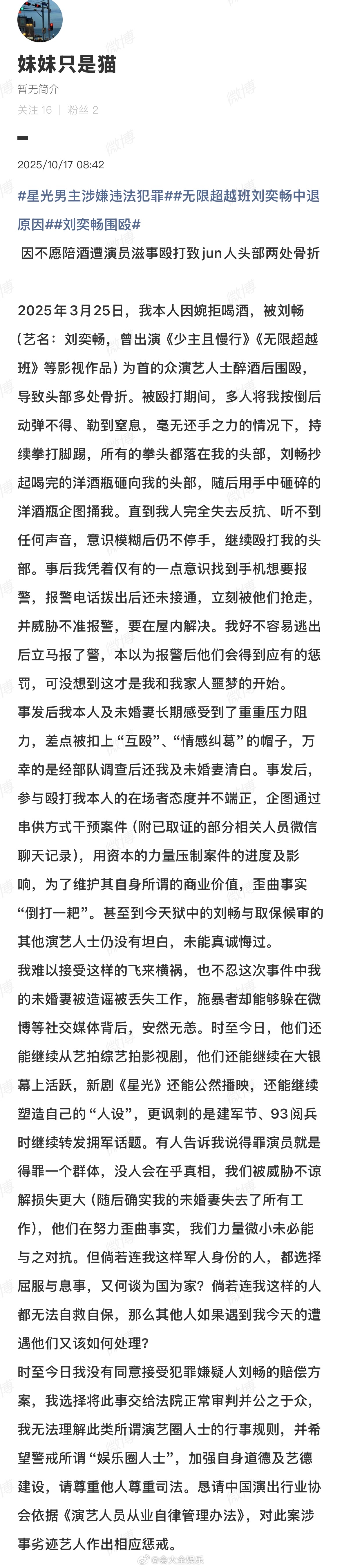 网友发布长文曝光自己因婉拒喝酒,被刘畅(艺名:刘奕畅,曾出演《少主且慢行》《无限超越班》等影视作品)为首的众演艺人士醉酒后围殴,导致头部多处骨折。他怎么敢的?