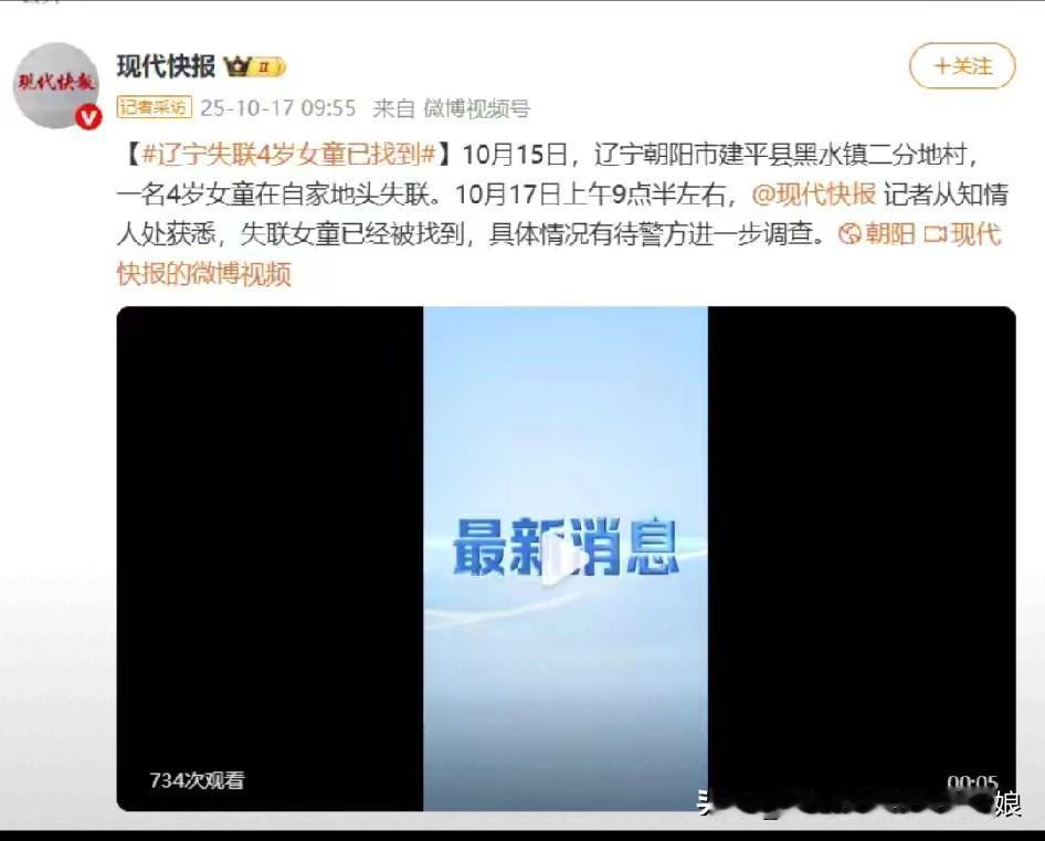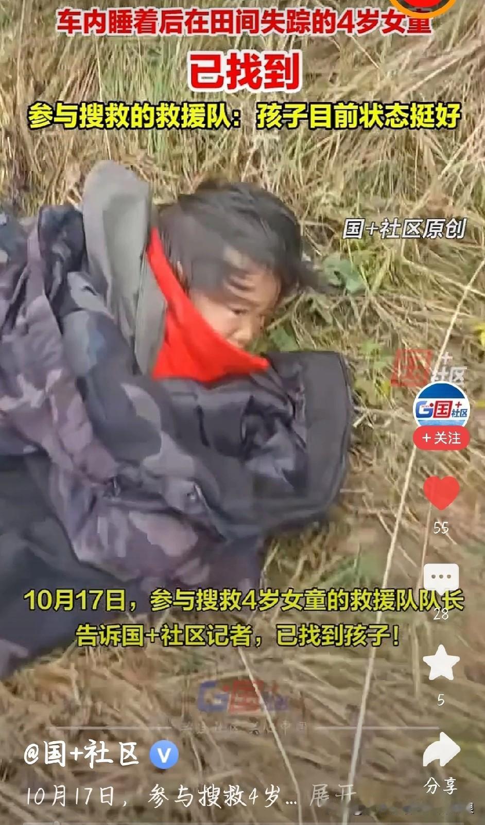太激动了!让全网揪了两天心的辽宁4岁女童,今天上午终于找到了,人好好的,一点伤都没有! 这两天真是煎熬坏了。15号下午,孩子跟着爷爷奶奶去地里收谷子,在面包车里睡着了,老两口想着离得近,就去干活了。结果没一会儿回来,车窗被摇开大半,孩子没影了。远在贵州打工的爸妈连夜往回赶,妈妈哭着说本来都找好幼儿园,打算接孩子团聚的。 上千人跟着揪心!镇上的人、警察、救援队全出动了,无人机、搜救犬搜了一遍又一遍,连悬崖、老鹰洞都查了,隔壁内蒙古的村民都骑摩托来帮忙。山里夜里零下好几度,还下雨,大家都怕孩子扛不住。 还好!最后在山上一个坑洞里找到了她,穿着那件标志性的红上衣,蜷在里面取暖,真是个聪明的小丫头。现在孩子已经回到爸妈怀里,除了受点惊吓啥事儿没有。 这结局太让人安心了!也给所有家长提个醒,孩子真的一刻不能离眼啊!辽宁失联4岁女童已找到 图片截图于网络