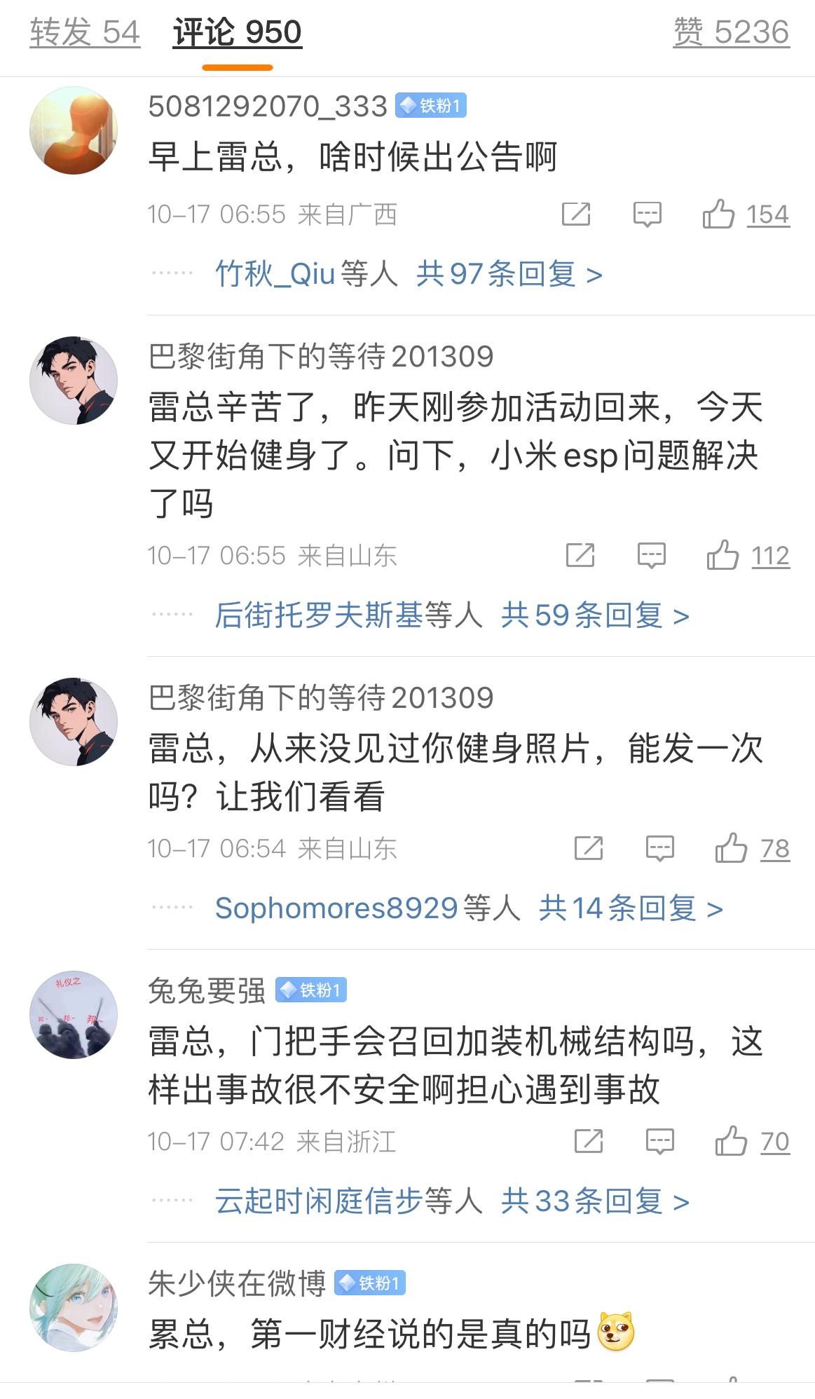 风口浪尖上的雷军! 10月17日,雷军通过社交媒体发布自己今年的第102次健身打卡。 不过其评论区全是涉及小米汽车成都事故的问题,跟以往的画风变化很大。 流量确实是把双刃剑,它会把你高高捧起,也会重重摔下。