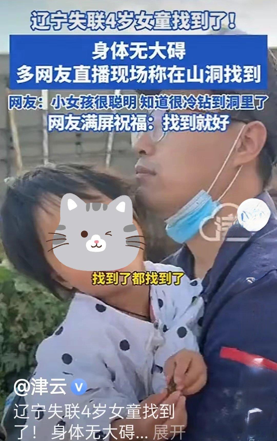 辽宁失联4岁女童已找到听说在山洞里找到的,小女孩很聪明,天冷知道躲到山洞里御寒,这个孩子将来会是个成大事的人!给辽宁政府部门、所有公安民警、以及所有参与搜救人员点赞,你们辛苦了。热点观点冒个泡