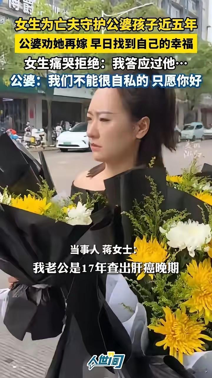 浙江,丈夫肝癌离世前那句“照顾好爸妈”,五年来,她像亲生女儿般侍奉公婆:寒冬深夜背发烧的婆婆去医院,雨天踩着泥泞给独居的公公送药,甚至放弃外地高薪工作留在老家。邻居们说,这个家从未因失去儿子而破碎——儿媳的孝心,让两位老人的白发间多了几分暖意。 然而,当公婆颤抖着说出“改嫁吧”时,这场亲情的双向奔赴才真正震撼人心。婆婆抹着泪说:“你才32岁,不该被我们耽误……”公公则偷偷塞给她一张存折:“这是我和你妈攒的,改嫁时买件体面衣裳。”蒋女士跪地痛哭的场景被拍下后,全网泪崩:这不是劝离,是父母对女儿最深沉的成全。 网友的呼声背后,藏着最朴素的智慧。认作女儿,既是对蒋女士五年付出的认可,也为她保留“常回家看看”的亲情纽带。这种超越血缘的羁绊,恰似暗夜里的微光,逝者已逝,生者的善意却能延续生命的温度。正如一位评论所说:“真正的亲情,是放手让你飞,却永远为你留一盏回家的灯。”