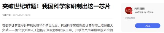 大的来了!中国直接掏出新芯片,算力超越顶级GPU千倍 10月15号这天,科技圈直接被一条消息掀翻了天! 北京大学人工智能研究院的孙仲研究员团队,拉上集成电路学院的研究团队,一起搞出了款能“改写算力规则”的狠活——基于阻变存储器的高精度、可扩展模拟矩阵计算芯片。 这可不是啥普通的技术小升级,是能让中国在算力赛道上直接“弯道超车”的大动作。 这款芯片到底有多牛?先看两个实打实的硬指标:精度上,它头一回追上了数字计算;算力和能效上,比现在最顶级的GPU还高百倍到千倍。啥概念? 以前用顶级GPU算一整天的活儿,这芯片攥在手里,几分钟就能搞定,电费还得省掉九成往上。就像有人还在用老式拖拉机耕地,突然来了台智能联合收割机,效率直接被按在地上碾压。 传统计算机靠数字电路里“0”和“1”的开关来运算。它虽然算得准,但速度慢得让人着急。 尤其碰到复杂的矩阵方程,数据得在存储器和处理器之间来回倒腾,跟快递卡在中转站一动不动似的,直接成了算力的拦路虎。北大这两支团队没走寻常路,转头用阻变存储器(RRAM)搞起了模拟计算。 这种存储器跟有“记性”的电阻似的,能通过电阻变化直接模拟信号强弱,省了数字转换那道麻烦工序,天生就适合一堆任务同时算。 但模拟计算一直有个致命缺点——精度低。以前的模拟芯片就跟高度近视似的,看啥都模模糊糊。孙仲团队硬是把这精度从“看啥都模糊的散光眼”调成了“连细节都清清楚楚的24K高清”。 他们靠迭代算法和位切片技术,先算出个大概的解,再跟剥洋葱似的一层一层细化,最后把误差压到了10的负7次方量级,跟数字计算的准头一模一样。 这么牛的芯片,到底能用到哪儿?先说说6G通信。未来的基站得支持上百根天线同时收信号、发信号,要处理的数据量跟发洪水似的。传统GPU处理这些信号,不光慢,还爱发烫。 这款芯片能实时把大规模MIMO信号检测搞定,手机上网速度能再翻好几番,到时候看8K视频跟刷抖音似的,连个缓冲圈都见不着。 再聊聊人工智能。AI大模型训练得靠海量的矩阵运算。现在的GPU算力跟细水管似的,训练一次模型得烧几十万度电。 北大这款芯片的能效比是GPU的100倍以上,相当于把细水管换成了高压水枪,训练成本一下就降了不少。 说不定以后每个人手机里都能装个“迷你版ChatGPT”,随时能陪你聊天、帮你处理工作,再也不用等云端响应半天。 还有自动驾驶领域。汽车得同时处理激光雷达、摄像头这些传感器传来的海量数据,对反应速度要求特别高。传统芯片反应总慢半拍,碰到突发情况很容易出问题。 这款芯片能在毫秒级把计算搞定,让自动驾驶变安全不少。碰到紧急情况,它能帮车提前0.5秒刹车,就这半秒,说不定能救不少人的命。 这次突破的意义远不止技术本身,它标志着中国在算力架构这块儿有了自主话语权。 以前,美国英伟达的GPU把全球算力市场垄断了,中国每年得花上千亿进口芯片,核心技术攥在别人手里,总怕被“卡脖子”。 现在北大团队搞出来的芯片,核心性能上实现了超越,为中国搭起自主可控的算力体系打下了基础。 更关键的是,这款芯片还打破了“模拟计算不如数字计算”的偏见。国际学术界一直觉得模拟计算是“夕阳技术”,没多少发展空间。但北大团队用事实证明,模拟计算在特定领域完全能“逆袭”。 这就跟武侠小说里的冷门武功似的,别人都瞧不上,可一旦练到家了,就能成为克敌的绝招。 现在全球算力竞争正打得火热。美国在推“芯片法案”,砸钱扶持本土芯片产业;欧盟在搞“芯片战略”,想在算力领域分一杯羹;中国也在加快布局,不想在这场竞争里落后。 北大团队这次的突破,就像在这场竞争里打下了一座关键的堡垒,帮中国在人工智能、6G这些未来科技竞争里占了先机。 当然,这款芯片现在还在实验室阶段,离大规模商用还有段距离。比如怎么提高量产的良率、怎么跟现有的计算机系统兼容,都是要解决的难题。 但孙仲团队说了:“我们已经证明了模拟计算的可行性,剩下的就是工程上的问题了。”这话里的底气,谁听了不觉得提气? 从“两弹一星”到“嫦娥奔月”,从高铁驰骋到5G领跑,中国科技一次次从跟着跑到领着跑。这次北大团队的突破,又让世界看到了中国科研的韧性和创新力。 说不定用不了多久,我们就能用上装着这款芯片的手机、电脑、汽车,亲眼见证中国算力引领全球的时代。 这不是科幻片里的情节,是马上要到来的现实。咱们等着瞧,看中国科技接着“狂飙”,在更多领域闯出自己的天地!