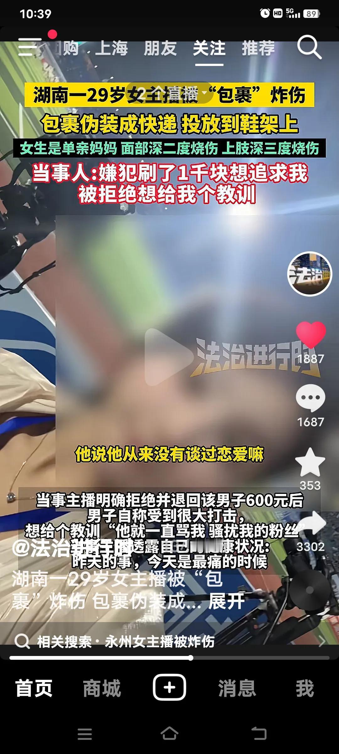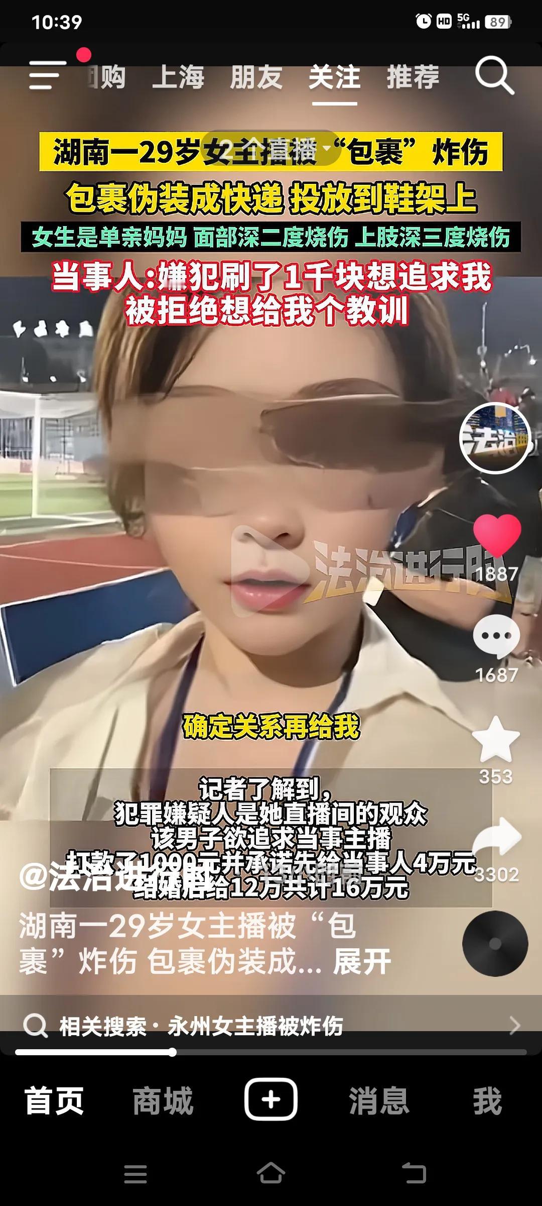 这种情况太恐怖了!29岁女主播的遭遇着实令人揪心!10月16日,湖南永州这位拥有7.8万粉丝的户外跳舞女主播发文称,自己15日被伪装成快递的炸弹包裹炸伤,面部深二度烧伤,手臂达深三度烧伤。包裹于14日晚被放在家门口鞋架上,她仅仅拿起看了一眼,包裹就爆炸了。 视频监控显示,有个戴帽子的男子出现在门口。女主播表示知道此人是谁,该男子是她的观众,声称要追求她,给她刷了1000块钱,还称先给她4万,结婚后再给12万,总共准备给她16万。女主播不同意,退还给他600元。 男子觉得受到了侮辱,加之此前从未谈过恋爱,便怀恨在心。他还在直播间辱骂女主播,谁能想到,他竟做出寄炸弹这种事。 目前,嫌疑人已被抓获。真是愚蠢至极,这种事也敢做?明摆着就是他干的,他能跑得了吗? 这件事也给女士们提了个醒,对于不合适的人,不要和他有任何金钱往来,别让他刷礼物,不是谁的礼物都能收的。况且女主播都退还600元了,这嫌疑人完全是自投罗网。 女主播并未贪图他的钱,被炸成这样,她还是个单亲妈妈,生活本就不易。她母亲看到女儿这般模样,十分难过,那些恶评实在不该,女儿那么懂事,希望她早日康复,坏人早日受到严惩。当事主播表示,以后不会再陷入感情纠纷。 女主播遇害事件 主播的遭遇 网红女主播遇害 女主播遇袭
