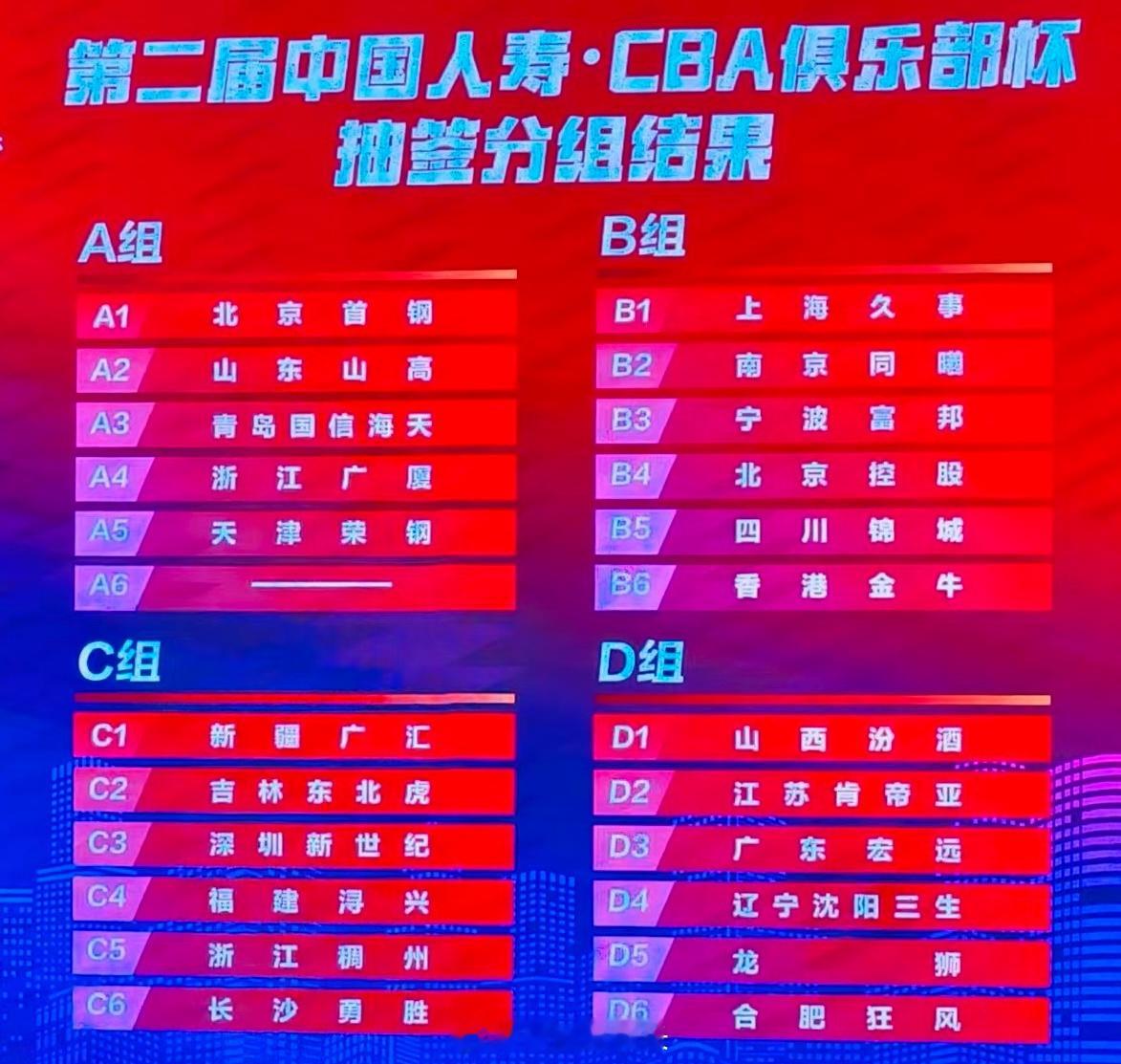 据探长了解,第二届cba俱乐部杯 抽签结果已经出炉,辽宁广东龙狮山西造“死亡之组”,另外,上赛季的总决赛对手北京首钢和浙江广厦也分在了同一小组。