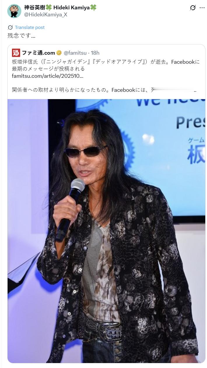 《死或生》《忍龙》系列制作人板垣伴信去世,《鬼泣》之父神谷英树通过个人推特发文悼念板垣伴信,他以"太遗憾了“(残念です…)表达了对板垣伴信的悼念。