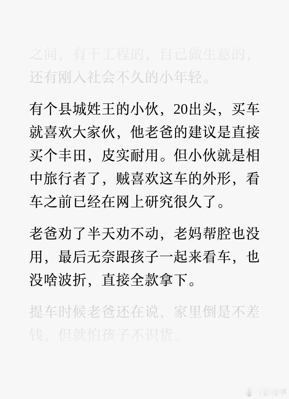 事实上他在我的建议下也看过几款新能源车,但总是觉得太花里胡哨,最后试了一次烈马来感觉了,没拦住直接秒提。虽然我觉得大可不必,但他自己用车还是很快乐的,闲的没事就去自驾游,或者当个钓鱼佬。后来我想明白了,作为从业者,总是不知不觉希望所有人都顺应潮流,但事实上还有很多人,他有消费能力,但并不是非要跟着时代走,买车符合自己的需求就好了。