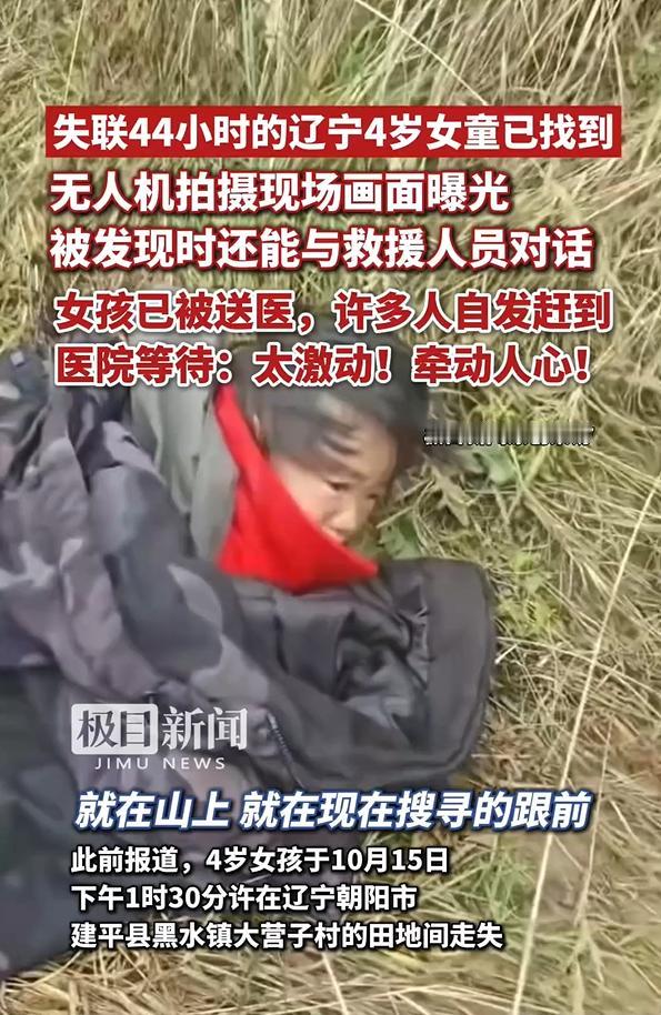 万幸啊!失联44小时的4岁女童找到了!据说是无人机勘察时发现的,穿着红色外衣躺在草丛里,精神状态还不错,能和救援人员对话! 从10月15日失踪,到10月17日上午找到,辽宁朝阳市建平县在面包车里“离奇失踪”的小女娃,终于平安归来。 这两天多以来,报道中传出过不少匪夷所思的信息,确实让人看得心慌慌…… 比如,搜救犬寻着气味到了公路边就停滞不前了,热成像仪地毯式搜寻也无果,道路监控也没有任何线索…… 尤其是搜救犬这个细节,当时好多人心都提到了嗓子眼——大家纷纷猜测孩子是被人抱走后,又坐车离开了,这才会使得搜救犬追到公路边就停止了! 如今,终于有了好消息! 孩子在山上的一处草丛里找到了,找到她时还能和搜救人员简单的对话,说明孩子身体状况不是太坏,也说明……或许根本没有坏人出现,这就是一场意外! 记得家属称,发现孩子不见时,面包车车门关着,窗户开着……于是就觉得有坏人抱走了孩子。 其实,4岁的小朋友完全可以自己从窗户爬出去,一切阴差阳错之后,才变成了这样一段悬疑剧情。 但是具体的失联原因……警方的《警情通报》里也没有提,或许还要等孩子在 医院救治恢复一下后再调查吧。 大概率是虚惊一场! 感谢这几天当地出动的12000人次的搜救力量,这个时刻北方已经很冷了,但是在看到女孩成功被找到那一刻,笔者我心里温暖如春……
