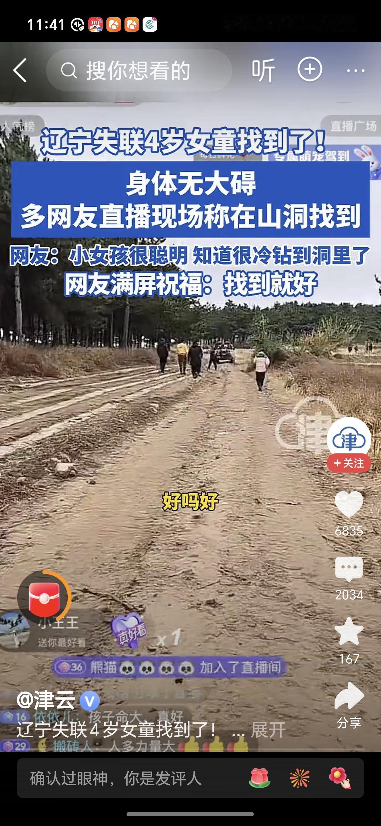 辽宁失联4岁女童已找到 辽宁4岁女孩在失联44个小时后终于被找到了,太让人欣慰了! 10月15日,辽宁朝阳市建平县黑水镇一名4岁女童在自家地头失联。当时她跟着爷爷奶奶秋收,在面包车里睡觉,等老人回来就不见了,车窗还被打开。 事情发生后,省、市两级公安机关高度重视,联合多方力量开展搜救,累计12000余人次投入救援。好在10月17日上午9点半左右,女童被成功找到,且生命体征平稳。这么多人齐心协力,终于有了最好的结果,感谢政府的重视,也感谢众多的搜救人员,孩子及家人是幸运的,希望后续警方能查明具体情况,也提醒家长们一定要照看好孩子啊。