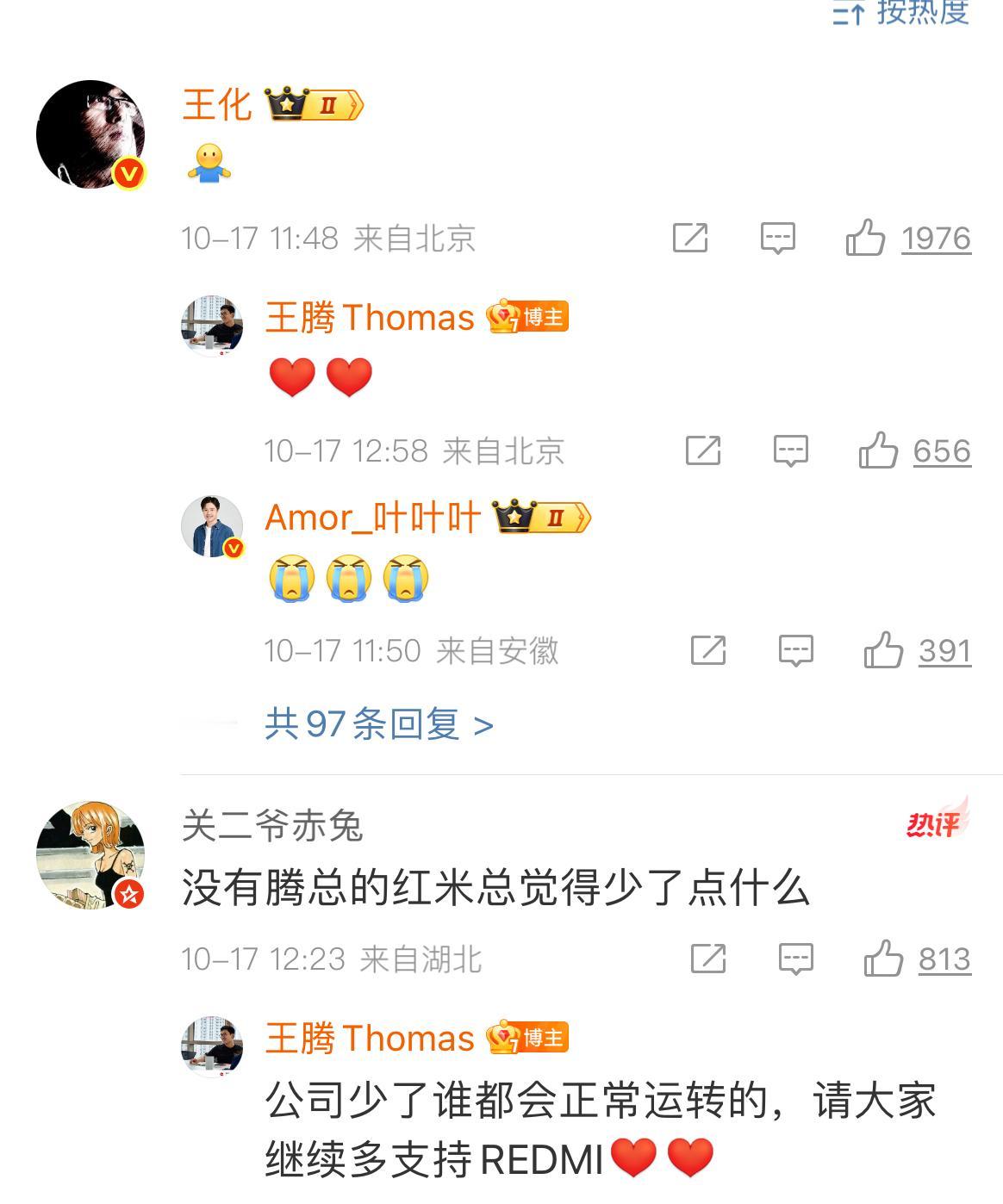 王腾与王化互动! 10月17日,被小米辞退的前高管王腾转发红米K90 Pro Max发布会信息,并预祝大卖。小米集团公关部总经理王化在王腾微博评论区留言“拥抱”表情,王腾回复“爱心”。 这一动作被广泛视为企业规则与私人情谊的分界点——既认可王腾对产品的付出,又明确双方关系止步于个人范畴,不涉及商业合作。 还有网友留言表示,没有腾总的红米总觉得少了点什么。王腾回复:公司少了谁都会正常运转的,请大家继续多支持REDMI。