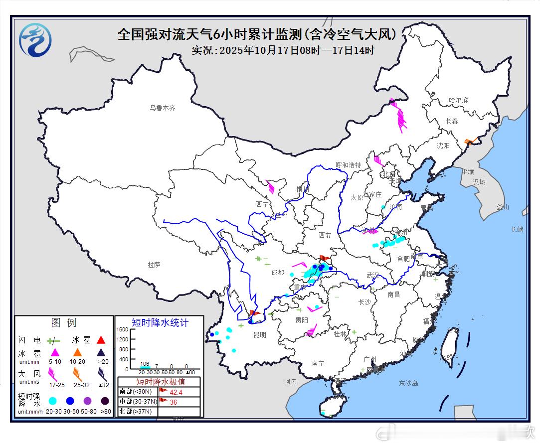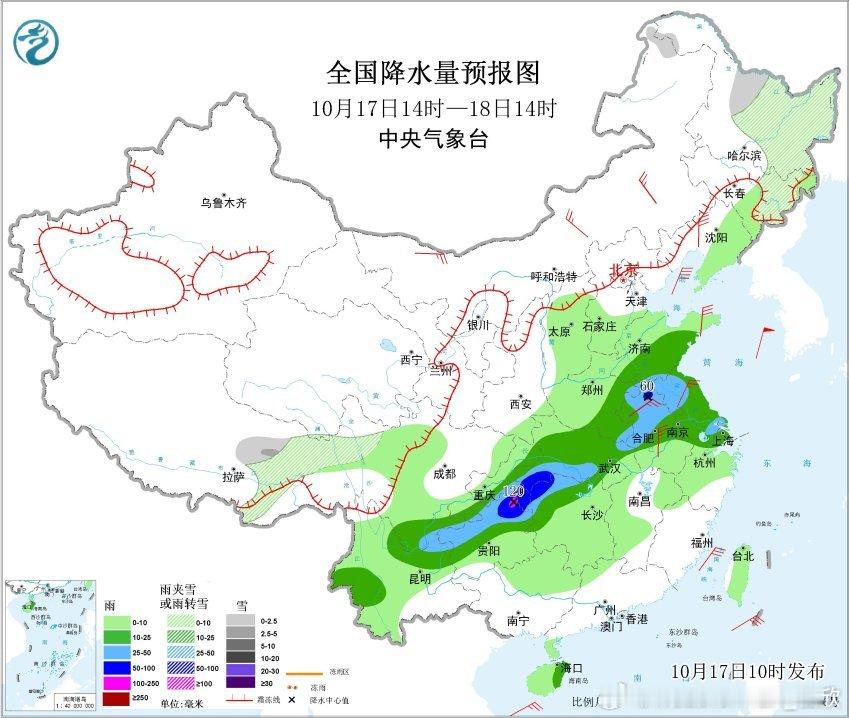 今天下午到明天中午,降水依然不少,强降水略有南压。预计,10月17日14时至18日14时,贵州北部、重庆东南部、湖北西南部、湖南西北部、河南东部、山东南部、安徽北部、江苏北部和东南部、云南东北部等地部分地区有大到暴雨,其中,重庆东南部、贵州东北部等地局地有大暴雨(100~120毫米)。