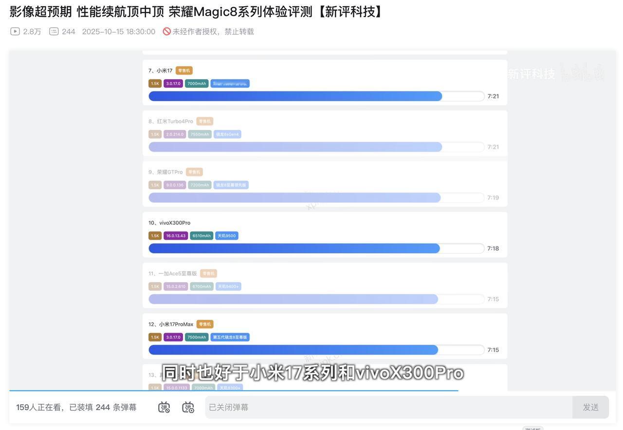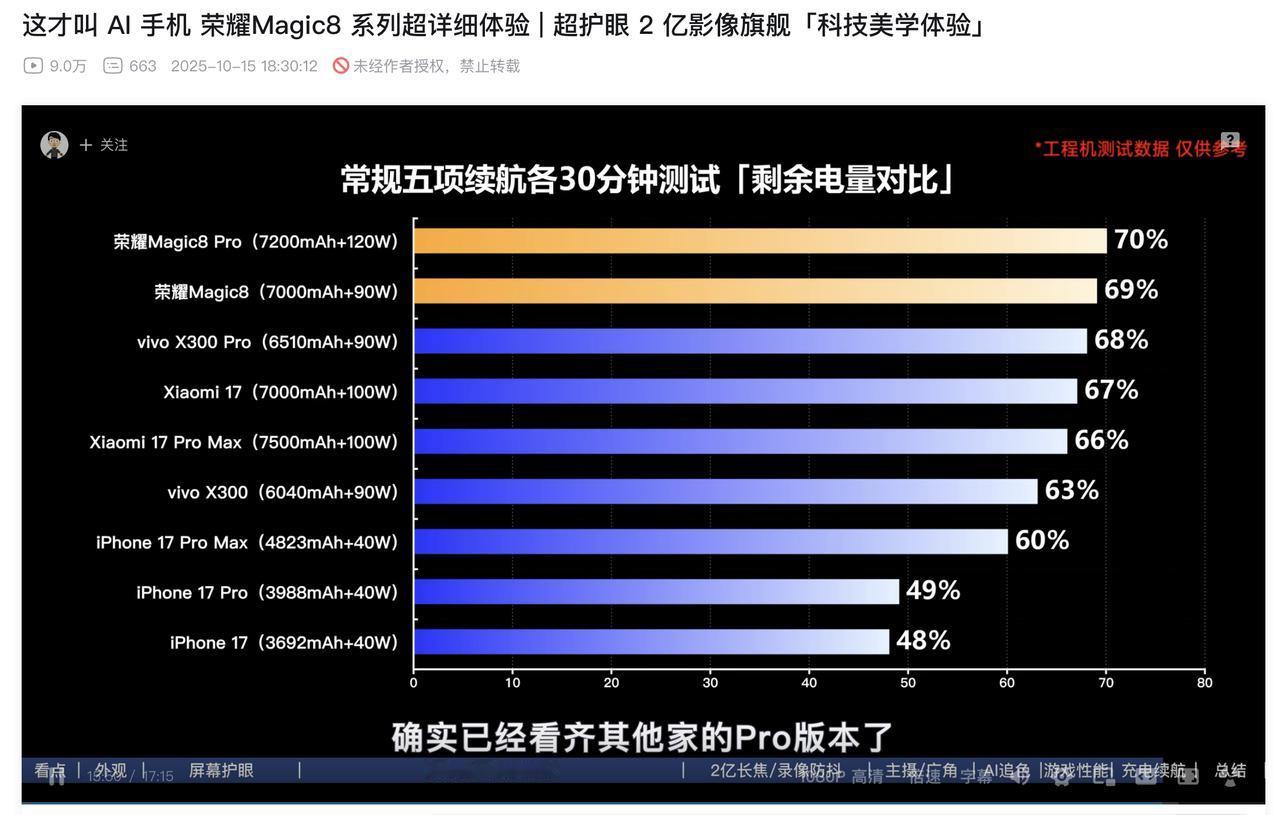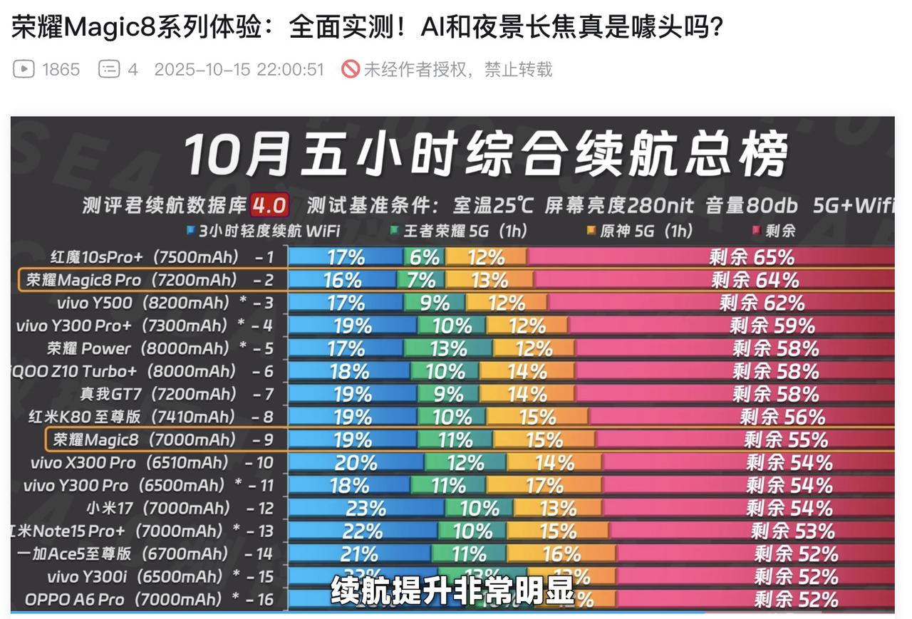 汇总几个大数码博主做得续航榜单,给大家说一下汇总数据: 1、Magic8和Magic8Pro的整体续航在一票新机里面是数一数二的,这个也符合之前的预期,荣耀家的续航一直都是很到位,上一代荣耀Magic7系列5000多毫安时硬扛友商6000毫安时,今年荣耀Magic 8系列都是7000毫安时,续航成绩可不就好起来了么。 2、几家榜单都显示,VIVO X300Pro的续航不错,起码没有大家想象的那么渣,说明VIVO这一次的半固态电池做的确实还是有点东西的。