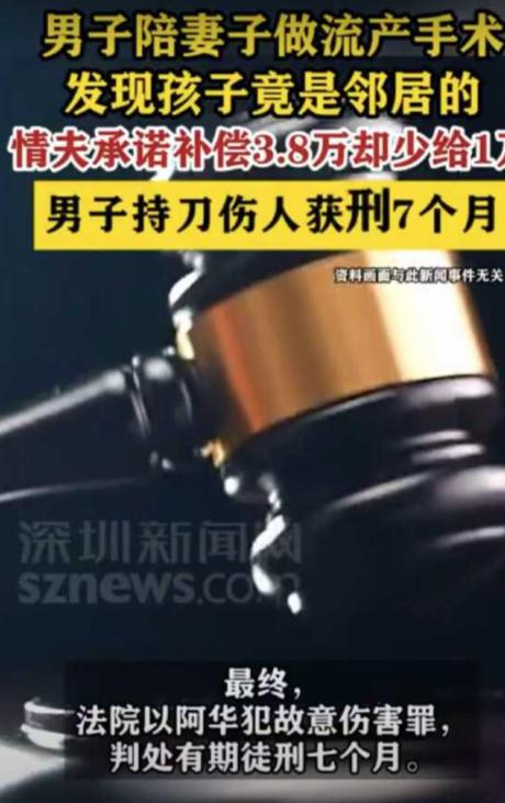 浙江,男子陪宫外孕妻子流产,随后发现孩子并不是自己的。竟然是对门邻居的,趁自己出门工作,造成妻子两次怀孕。男子找到邻居对峙,邻居供认不讳,并承诺赔偿3.8万元,然而剩下1万迟迟不肯归还。男子醉酒后越想越气,竟提着刀去找邻居,最后被判处有期徒刑。 周强与妻子林霞(化名)结婚已有两年。两人感情曾经很好,家境虽不富裕,却相互体谅。 周强在外地做工程项目,每个月大半时间在外,只有月底能回家几天。林霞在家做电商客服,平日里除了工作,就是和邻居们串门唠嗑。 今年7月初,林霞突然腹痛,被紧急送往医院。医生诊断为宫外孕,需要立刻手术。周强连夜赶回家,陪着妻子在病房守了两天,细心照料。 手术结束后,医生随口问了一句:“你们最近有没有做过婚检或血型检查?这次的血型结果不太一样。” 这句话像一根针,扎进了周强心里。他起了疑心,趁妻子出院那天,私下到医院调取了相关检验记录。没想到,一份亲子排除报告让他如坠冰窟——胚胎的DNA与他完全不匹配。 那一刻,他整个人都懵了。七年的婚姻,竟成了别人的笑话。 几天后,周强冷静下来,决定查个水落石出。他没有立刻质问妻子,而是暗中观察。 一天夜里,他下班回家,看到妻子在阳台上偷偷接电话,语气温柔,笑声暧昧。他心中怒火中烧,却强忍着,偷偷装了一个录音设备。 第二天,录音里的内容让他彻底崩溃——电话那头竟是对门邻居邵某,一个四十多岁的离异男人。两人谈笑着提起“上次在家里差点被发现”,还提到了“下次要小心点”。 周强终于明白,一切并非偶然。妻子出轨的对象,就住在他每天擦肩而过的门对面! 当晚,他强压怒气,直接敲开了邵某的门。面对质问,邵某先是死不承认,但当周强拿出录音和医院报告后,邵某彻底慌了,低着头连声道歉。 最终,他承认自己趁周强长期外出,和林霞发生不正当关系,甚至导致林霞两次怀孕。 那一刻,周强手在发抖,差点忍不住动手。最后,在妻子和几位邻居的劝解下,他冷冷地说:“赔钱,离我们远点。” 第二天,双方坐下来谈“私了”。邵某承认错误,同意赔偿周强精神损失费3.8万元,并写下保证书,承诺以后绝不再与林霞有任何往来。 可是到了付款那天,邵某支支吾吾地说:“我手里紧,只能先给2.8万,剩下1万下个月发工资后给你。” 周强沉默了很久,最后咬牙点头。他心想,算了,只要这件事就此结束。 可现实并没有给他喘息的机会。半个月过去了,邵某不仅没还那1万元,反而在小区里到处炫耀,说“那傻子还信我写的保证书”。 这话很快传到了周强耳朵里。他整整两晚没合眼,怒火像被点燃的火药,一触即发。 案发那天是9月21日晚。周强在工地上喝了不少酒,回家途中路过那幢熟悉的楼,看着邵某家亮着的灯,脑中浮现出妻子的背叛和邵某的冷笑。 他越想越气,最终冲上楼,从厨房拿起一把水果刀,径直敲开了邵某的门。 门刚一开,周强就怒吼着冲了进去。邵某还没反应过来,就被周强一刀砍在肩头。邵某母亲听到动静赶来阻拦,也被波及,头部和手臂被划伤。现场一片混乱,邻居们听到呼救声纷纷报警。 几分钟后,邵某母子被送往医院抢救,所幸伤势稳定。周强则在情绪平复后,于第二天一早主动到公安机关投案自首,并如实供述了全部经过。 经司法鉴定中心鉴定:邵某头部受伤,构成轻伤一级;邵某母亲头部、手部受伤,构成轻微伤。 法院认为,周强因家庭矛盾引发的纠纷,行为虽有可理解之处,但其持刀伤人,已严重危害社会秩序,构成故意伤害罪。 考虑到其自首情节、认罪态度良好、伤者未造成重大后果,依法从轻判处。最终,法院判处周强有期徒刑二年,缓刑三年。 宣判那天,周强泪流满面。他说:“我不是坏人,只是那一刻,心碎得太彻底了。”