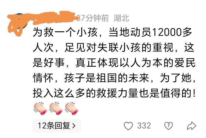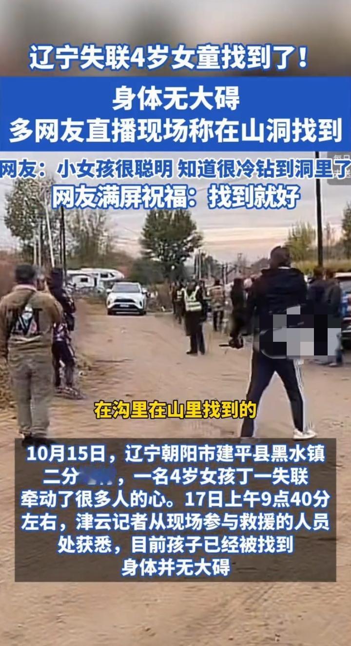 失联44小时后,辽宁4岁女童终于被找到了!10月17日上午,失联女孩的堂姑妈告诉记者,现在小孩是安全的,目前正送往医院,总之孩子找到了,感谢大家。 起因3岁女童从地头面包车内失踪 ,爷爷讲述孩子失踪经过;当地约上千人连夜冒雨搜救,网友评论:“为救一个女孩动员12000多人来搜救小女孩这就是祖国的强大”