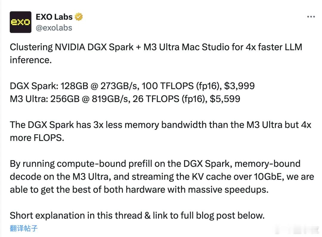 恰好DGX算力强但带宽差,Mac Studio的M3 Ultra带宽高但算力弱。于是他们做了一个“优势互补”的组合: