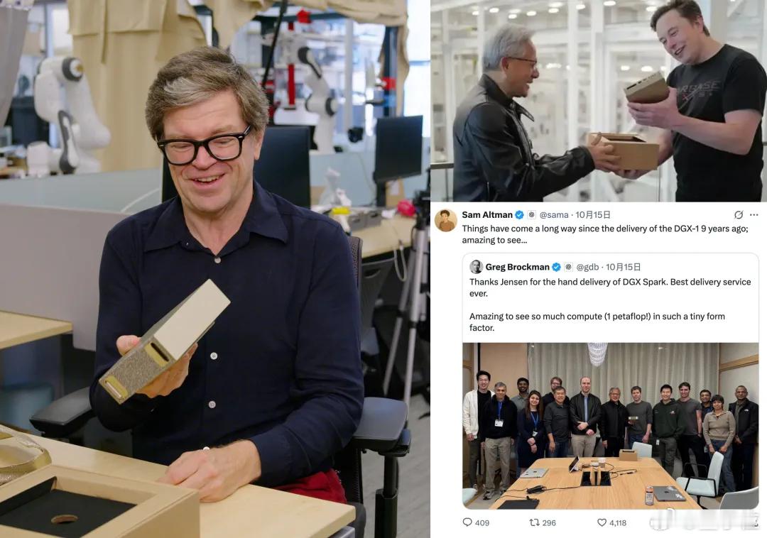 有趣的是,EXO团队这次用的DGX Spark,最近正在进行配送,马斯克、奥特曼还有LeCun都收到了,其中还有老黄亲自送货上门。【图3】
