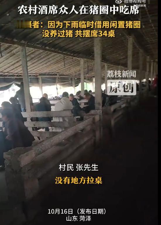 “头一次见!”村民下雨天坐猪圈吃席:猪圈没养过猪,共摆席34桌 近日,山东菏泽单县一村民因下雨无法在户外办丧宴,临时借用闲置猪圈摆席34桌。村民张先生解释,该猪圈未养过猪,此前也因天气原因有过类似安排。 山东菏泽单县的一场雨天丧宴,彻底火出了圈。本该在院子里开席的场面,因为连绵的秋雨全挪进了闲置的猪圈,34 张方桌摆满了原本用来养猪的空棚,村民们围着热气腾腾的菜肴吃得热闹,这张被传到网上的照片,让不少人惊呼 “真是活久见”。 事情得从一场突如其来的降雨说起。当地一户村民家办丧事,按照山东农村的老规矩,白事宴席得摆在自家院子或村口空地上,图的就是个热闹和方便乡亲们往来。可办席前一天夜里,雨突然下了起来,淅淅沥沥直到第二天清晨都没停,院子里积起了半脚深的泥水,别说摆桌子,连下脚都费劲。 主家急得团团转时,同村的张先生出了主意 —— 用村东头那间闲置的猪圈。张先生在村里住了四十多年,是出了名的 “万事通”,村里大小红白喜事的后勤都是他张罗,经验格外丰富。他心里清楚,那间猪圈看着不起眼,其实是三年前新建的,因为主人家后来改做了运输生意,一直没养过猪,地面铺了水泥,屋顶也是结实的彩钢板,遮风挡雨再合适不过。 开席时,雨下得正密,猪圈里却暖意融融。四凉八热的菜肴陆续端上桌,炖得软烂的排骨、油光锃亮的烧鸡、飘着香气的丸子汤,全是鲁西南宴席上的硬菜。村民们端着酒杯聊着天,没人觉得在猪圈吃席有什么不妥,毕竟在当地农村,红白喜事讲究 “宁让客等人,不让客等席”,只要能按时开席、招待好亲友,场地从来不是问题。 张先生后来解释,这已经不是村里第一次用闲置场地应急办席了。前年夏天有户人家办婚宴,突然遇上雷阵雨,就是把宴席挪到了村头的旧仓库里。这些闲置的猪圈、仓库虽然看着简陋,却比临时搭棚子更结实,而且像这处猪圈,因为没养过猪,连一点异味都没有,打扫干净后比露天场地还实用。 在农村,这样的 “应急智慧” 其实很常见。就像广东湛江曾有村子因为台风积水,把婚礼办成了 “水上婚礼”,新人坐船迎亲,宾客乘货车赴宴,照样热闹圆满。山东农村的宴席更是向来不拘小节,讲究的是食材实在、人情浓厚。这次猪圈里的宴席,每道菜都是后厨师傅现做现端,分量足味道正,不少村民都说 “比城里饭店的宴席吃着舒坦”。 更有意思的是,这处被用来办席的猪圈,其实代表了不少农村闲置资源的新用法。如今很多农村地区,像这样没养过猪的闲置猪圈并不少见,有的被改造成了手工作坊,有的变成了自然教育基地,而单县村民把它用来应急办席,算是最接地气的 “盘活” 方式。既解决了雨天办席的难题,又没浪费现成的场地,透着一股实在劲儿。 当天的宴席一直吃到傍晚雨停才散场,34 桌饭菜被吃得干干净净。有人把现场照片发到网上,立刻引发了热议,有人好奇 “猪圈里吃饭会不会有味道”,也有人感慨 “这才是真实的乡村人情”。对村民们来说,场地在哪不重要,重要的是能聚在一起,帮主家渡过难关,这才是农村宴席最核心的意义。 对此,你们有什么看法,欢迎评论留言~