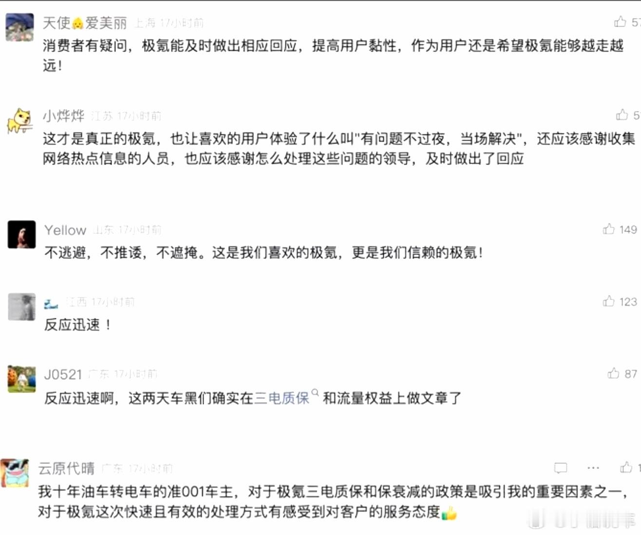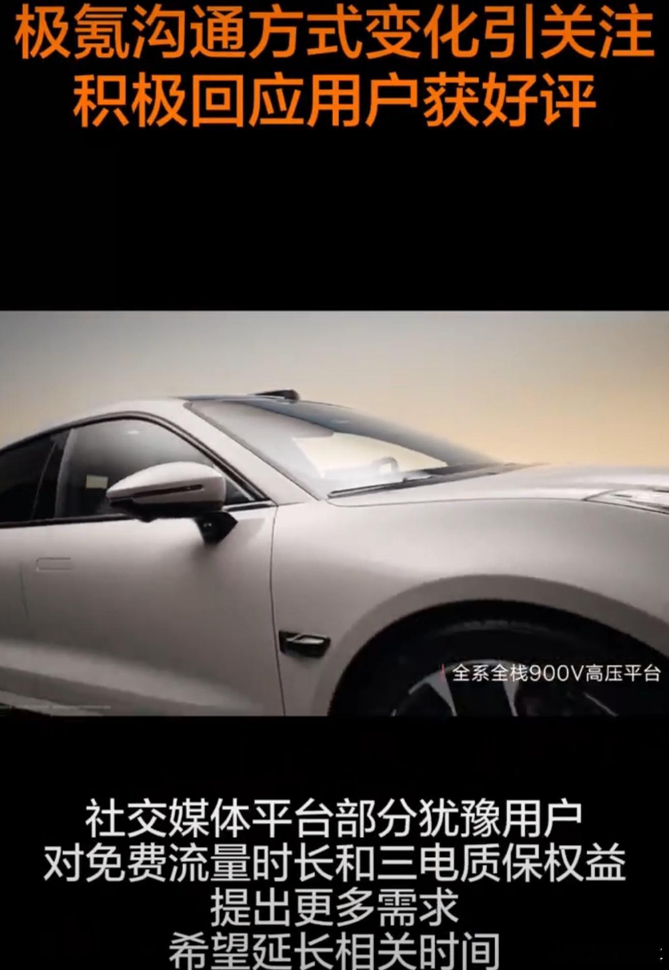 极氪积极回应用户获好评 极氪这波操作,把用户的心拿捏得死死的!软硬件做得相当扎实,有用户纠结免费流量时长、三电质保等权益,希望延长时间,结果极氪那叫一个麻利,第一时间就出来说,过渡期内仍为焕新001用户提供终身三电质保及流量权益,让大家心里的石头落地,获得大家不少好评!