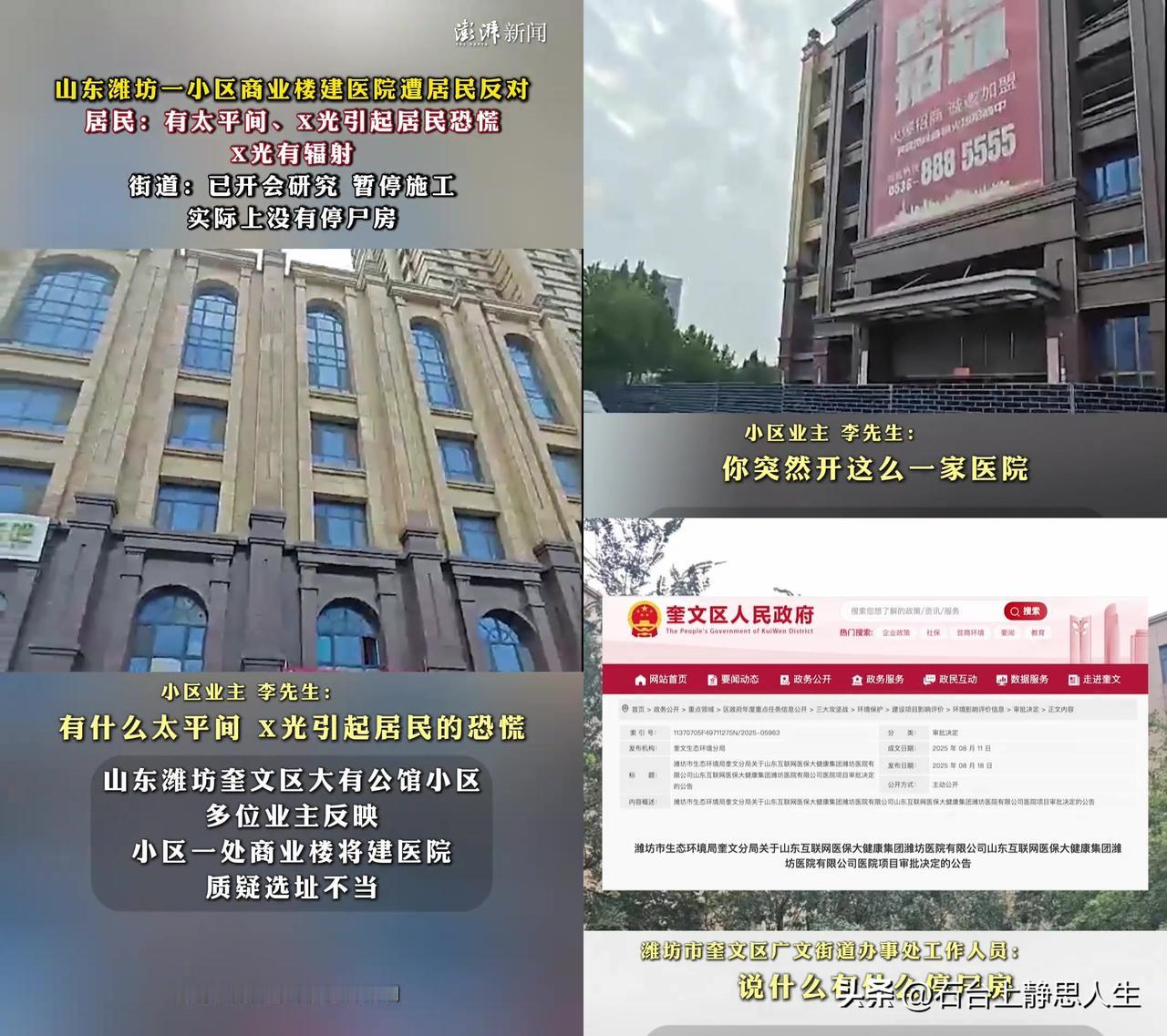 潍坊大有公馆的业主们最近快愁死了! 小区商业楼要建医院,大家举着牌子反对,可细扒下来,他们怕的俩事儿,居然都是误会? 最膈应的是有太平间,街道明确说没有! 可大家还是怕,不就是怕临终关怀的联想嘛? 谁愿意家旁边有送最后一程的地儿? 可没有太平间的澄清,咋就没抚平心慌? 再说说X光,居民怕辐射致癌, 可有人说,X光的辐射比电脑、电视还小! 现在防辐射技术早成熟了,咋一听辐射就腿软? 还不是对专业词的本能害怕? 更巧的是,小区北边就是潍坊市人民医院, 好多医生护士都住在这,人家天天和医院打交道, 咋没闹?难道他们不怕辐射? 业主怕的不是医院,而是不知道里面要干啥的不安! 怕太平间是怕看不见的忌讳, 怕辐射是怕听不懂的风险, 换你住这,你怕的是医院本身,还是没人说清楚的心慌? 要是你家小区要建医院,你最担心啥? 是有太平间、有辐射,还是没人事先跟你商量? 大家聊聊,我蹲个答案!