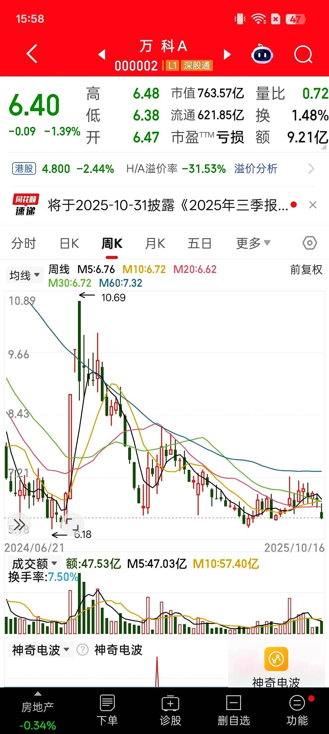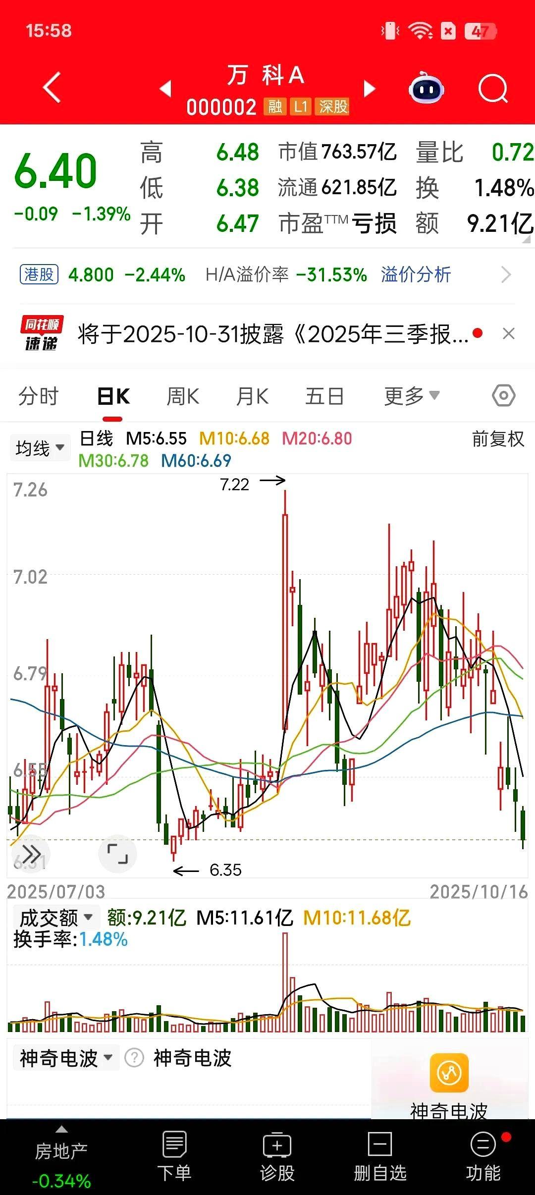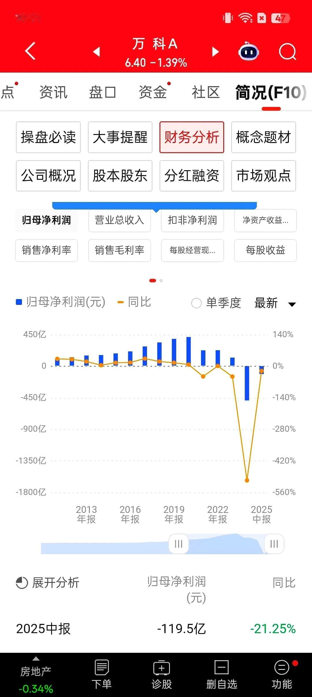 继续跳水! 又是六连阴了。 万科A,妥妥滴万科哀,万科癌! [捂脸]照这样下去,怎么得了? 中报显示,净资产还有12.4元每股。 现在股价只有6.4元了,还没有止跌的迹象! 真怀疑财报,不是个假的,也是个水货! 网友对此说道: 深铁借那么多钱,优质抵押物早就抵过去了,剩下那些一清算值不了几个钱 净资产里的房子土地可能是按以前的价格计价的,这一轮跌了这么多,哪天一重估,净资产或许就大幅减值了。 为化债万,科这个股票跌不下去了,怎么跌也跌不动,安心持股等待大涨。 公司都被王石郁亮这伙人,通过体外鹏金所掏空了,结果就是退市,能跑就跑吧