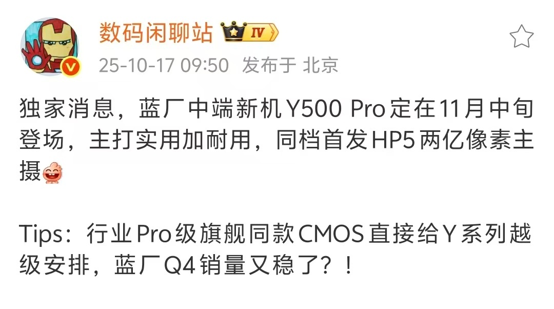 根据站哥发布的消息,vivo Y500 Pro将会在11月中旬上市,这是首款搭载行业Pro级旗舰同款CMOS的新机,一定会拉高中端机影像的上限。不得不说蓝厂太懂用户需求了!