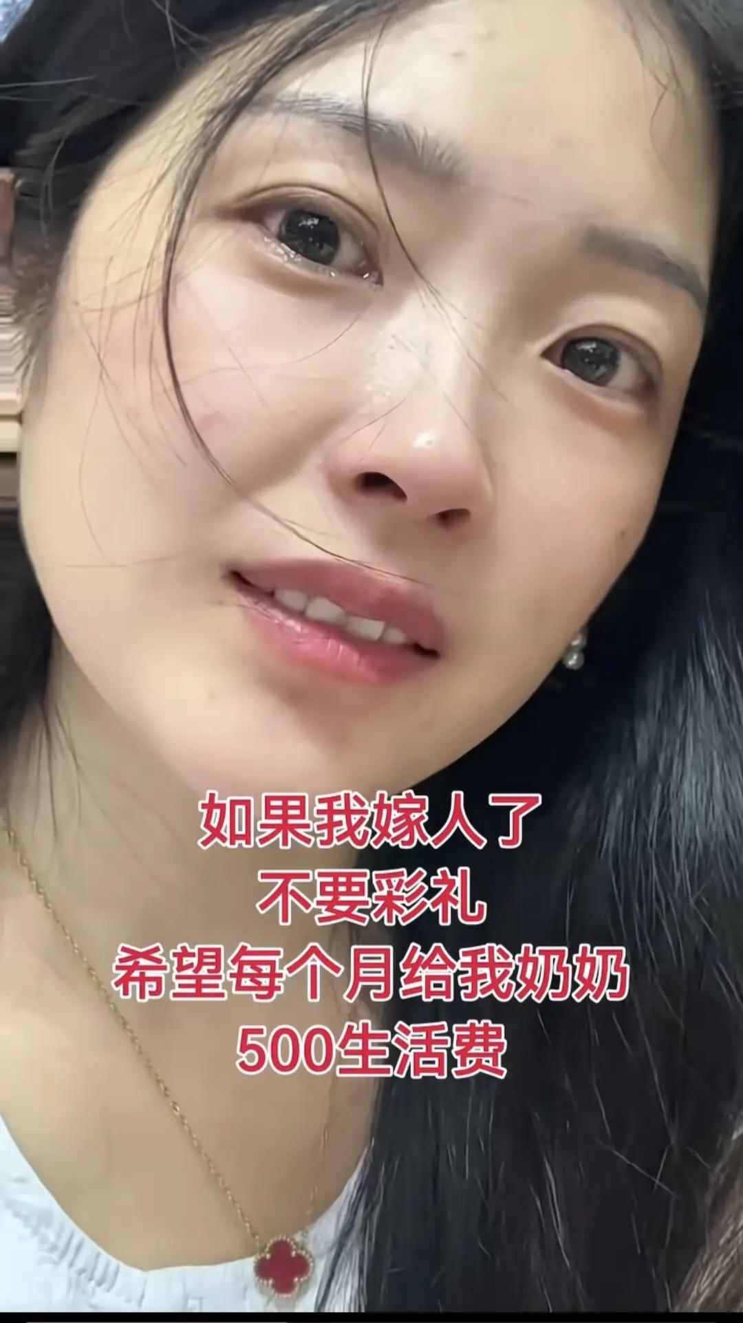 看着身边已经90岁的奶奶,女孩含着眼泪说:如果有一天我嫁人了,我不要一分钱彩礼,希望每个月能够给我奶奶500元生活费,如果能够接奶奶一起生活,我会一辈子追随!好孝顺好善良的女孩,时时处处想着奶奶!也不枉费奶奶小时候的疼爱与呵护! 多好的女孩!这样的要求真的一点也不过份!500元一个月,对于一个有责任心的男人来说,真的一点也不多! 希望女孩能够早日找到自己的如意郎君,一起照顾奶奶,让奶奶能够长命百岁!不知道哪个小伙子有这个福气!