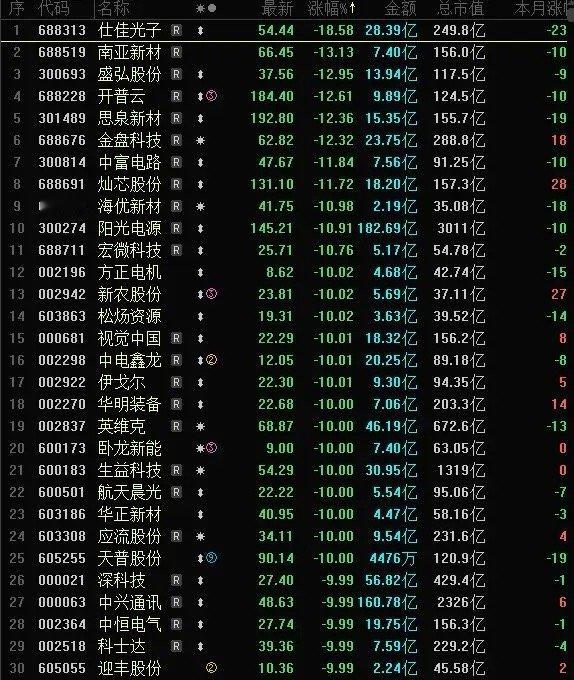今天跌幅榜清一色高标人气股,开普云大跌12CM,思泉新材大跌12CM,金盘科技大跌12CM,灿芯股份大跌11CM,阳光电源大跌10CM,方正电机跌停,视觉中国跌停,英维克技跌停,深科技跌停,中兴通讯跌停,中马传动跌停。