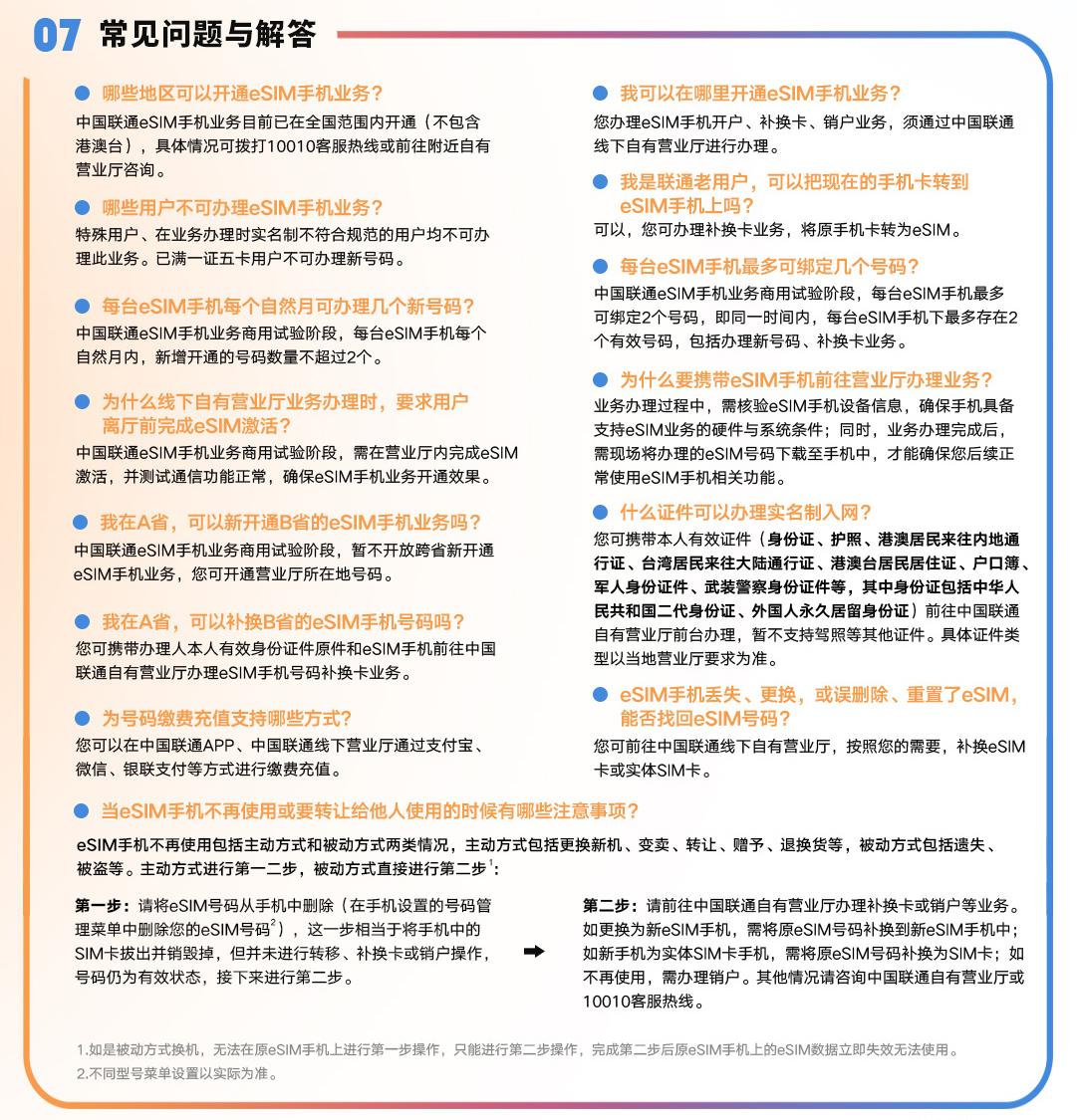中国联通关于eSIM手机业务的常见问题与解答,写的非常详细。打算换eSIM手机的网友可以看一看。 比较值得一提的点有: 1、大部分业务都需要机主本人携带身份证前往营业厅完成。包括开户、换补卡、销户等业务。 2、外省的eSIM手机补办号码,不用回到号码开通所在地,直接前往当地营业厅即可。 3、暂时不支持跨省新开通eSIM手机业务,也就是说在A省不能办理B省的套餐业务。