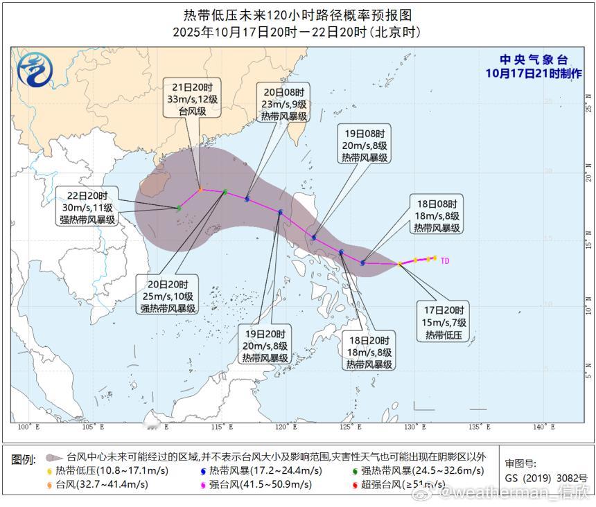 【台风展望】今晚菲律宾东边的低压,结构还不是很紧实,暂时维持低压评价。明天将发展为今年24号台风风神。穿过菲律宾后,进入南海,向我国华南靠近时,因为有强冷空气南下,对其压制,使得路径向西南折,最后可能就在南海上消亡了。