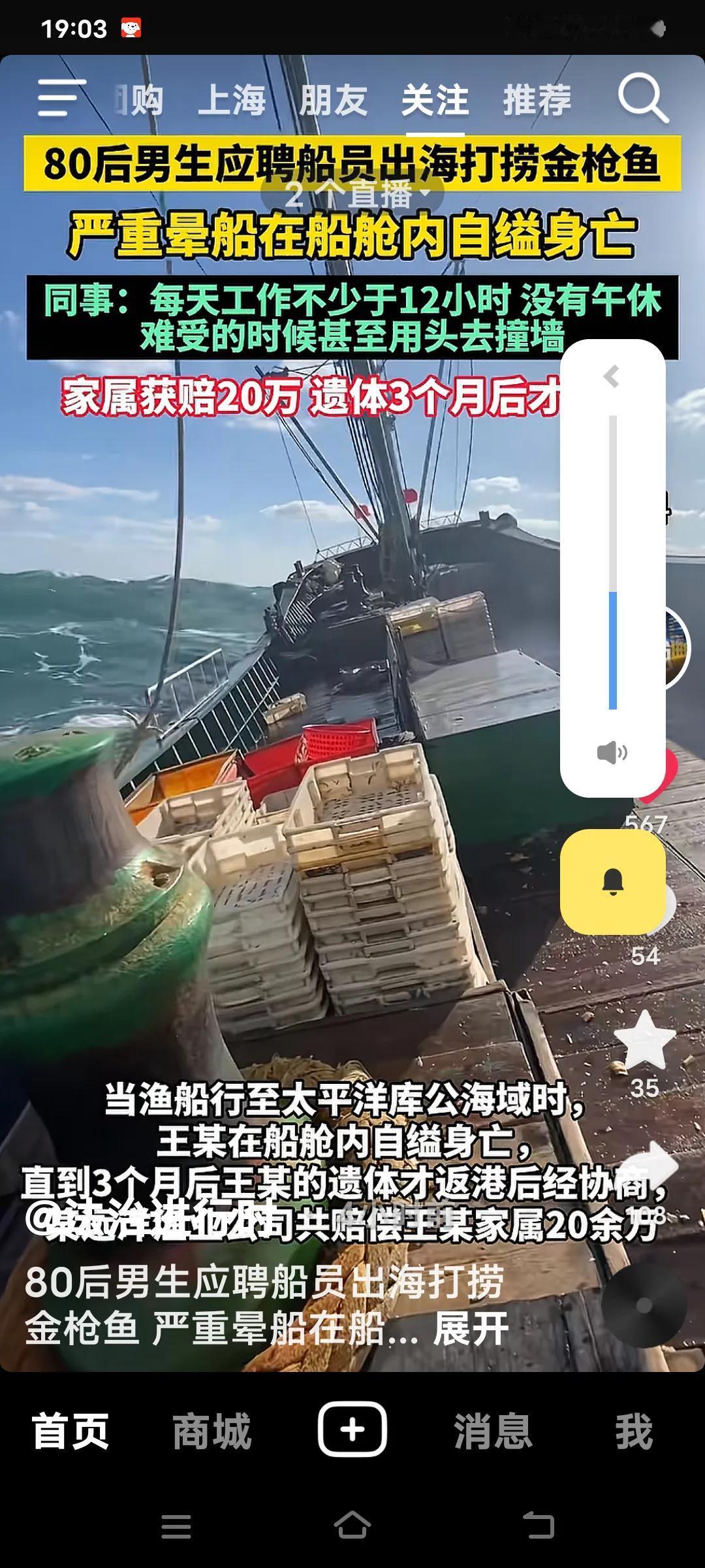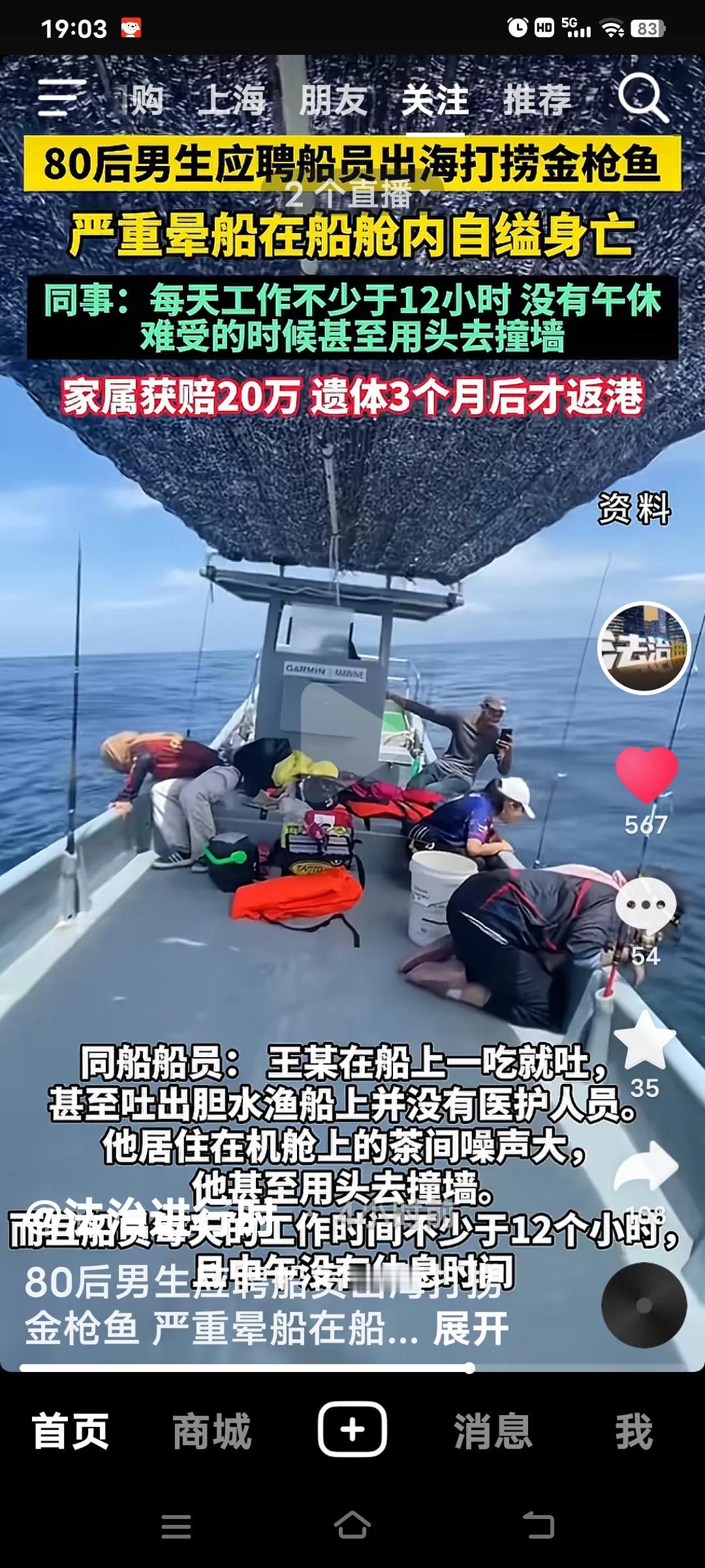 悲哀!1980 年出生的王某,2023 年应聘到公海渔船打捞金枪鱼,怎料出海后竟严重晕船。同船船员说,他晕船到无法进食,一吃就呕吐不停,连胆汁都吐了出来。 船上没有医护人员,再加上每天工作不少于12小时,他住的机舱噪声大,他甚至用头撞墙。身体状况糟糕透顶,在太平洋库克海域,他在船舱内自缢身亡,3 个月后遗体才回到港口。 事后,远洋渔业公司赔偿 20 余万元。可叹呐!据说,干这份工作不是说辞职就能辞职的,出海一趟至少一两个月。他无奈之下选择自缢,一时冲动便结束了生命,也不想想家人会多么悲痛。 人生没有下辈子,死很容易,想再活可就难了!正值壮年,只要想开些,凡事都会有转机。此路不通走彼路,只是需要时间,要等到合适的时机才会有更好的安排啊!