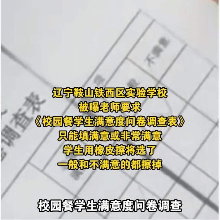 这事儿可真够讽刺的。辽宁鞍山一所学校搞了个校园餐满意度调查,结果老师直接要求学生只能选“满意”或“非常满意”。有学生本来选了“一般”和“不满意”,全被老师用橡皮擦掉重填。 消息一出来网友都炸了。有人说这不明摆着做戏吗?还有人说:“批评都不让,这种满意有什么意义?” 现在当地教育局已经成立调查组,说要全面核实处理。 说实在的,这种操作挺让人无语的。问卷调查本来是为了发现问题、改进工作,现在倒好,直接变成了一场表演。连学生表达真实想法的权利都要剥夺,这还谈什么素质教育? 学校注册资本43万,办学宗旨写得挺漂亮:“全面贯彻教育方针,面向全体学生,全面落实素质教育”。可实际做法却跟说的完全两码事。 校园餐好不好吃,学生最有发言权。如果真的难吃或者分量不够,就该让学生说实话,然后去改进。现在这样逼着学生都说好,不是自欺欺人吗? 这种形式主义真的该改改了。教育孩子要诚实,可学校自己却在弄虚作假,这不是很矛盾吗? 希望调查组能认真处理,别又是不了了之。校园餐关系到学生的健康,应该重视学生的真实反馈,而不是用这种手段制造假象。