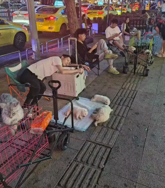 笑不活,重庆,一小伙在街头闲逛时,无意间看到一宠物老板在路边摆摊期间,和他的小动物们一起在路边睡觉的有趣一幕。视频显示,老板趴在自己的物品箱上睡着了,而他身边的四只阿猫阿狗,竟也在其旁边呼呼大睡。可见,三只小奶狗各自躺在隔尿垫上睡得正香,而老板趴着的物品箱上,还有一只小猫咪依偎在老板怀里呼呼大睡。而让人想笑又暖心的一幕,也是逗得小伙憋笑着将其拍了下来。 小伙表示,老板和他的宠物们对生活的态度太巴适了!这哪像是在摆摊,更像是在街边露营享受生活! 对此有网友表示:卖宠物的老板和他的宠物们都睡着了,而且都不会趁主人睡着了偷偷乱跑,可见他们之间的感情是有多好! 还有网友表示:老板贴心,隔尿垫都它们安排上了,关键是他们都说得好安逸,这家宠物可以买,话说那个睡隔尿垫中间的胖白多少钱?[大笑] 不得不说,好可爱的几小只小猫小狗,话说狗子跟着主人睡觉不跑能理解,但能养得猫都不乱跑,说明老板对他的动物们都很好,所以小动物们对他都没有戒心。而这人与动物和谐相处的一幕,真是让人看得开心又温馨!