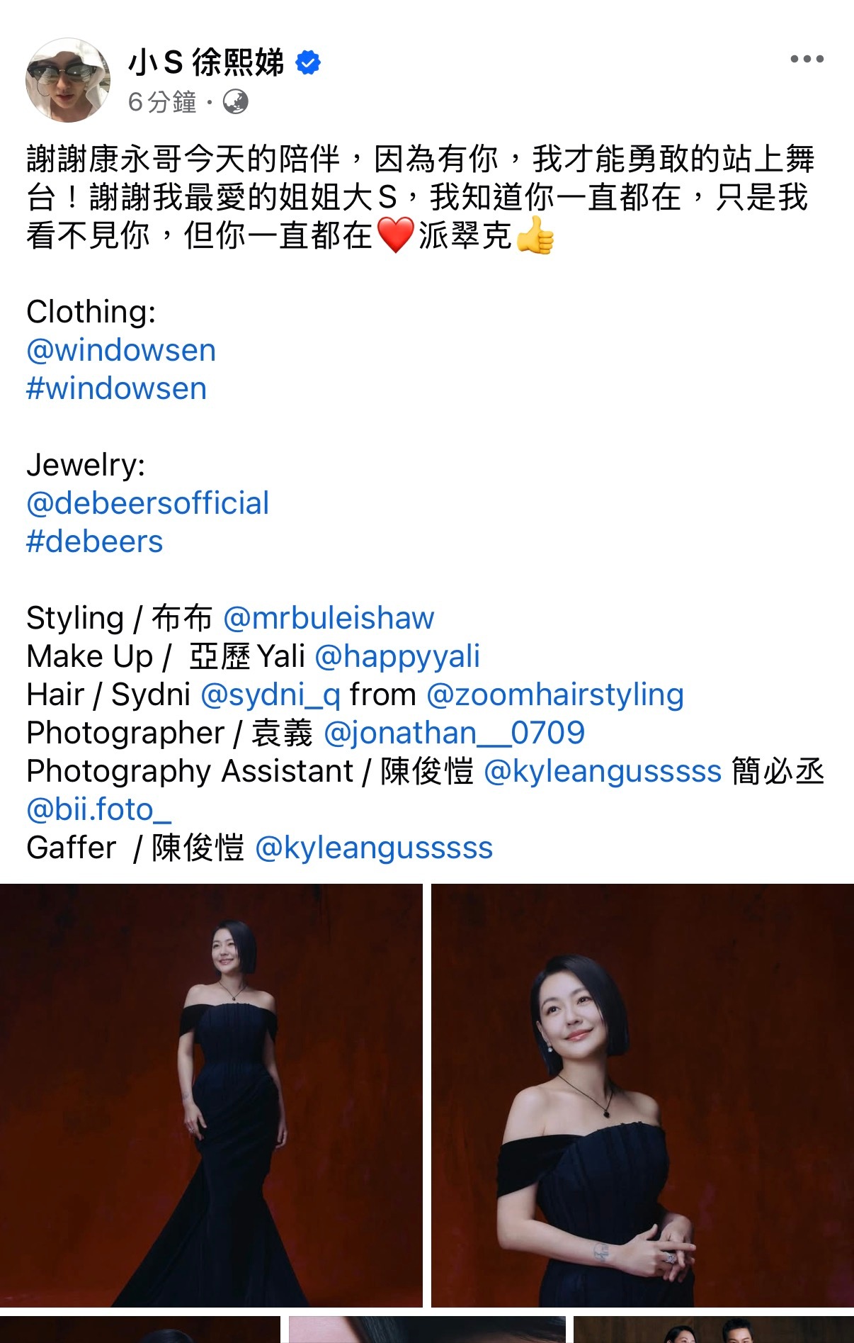 小S 发文:谢谢康永哥今天的陪伴,因为有你,我才能勇敢的站上舞台!谢谢我最爱的姐姐大S,我知道你一直都在,只是我看不见你,但你一直都在❤️派翠克👍