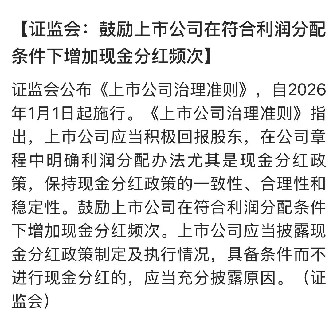 证监会公布《上市公司治理准则》,自2026年1月1日起施行,要求上市公司有利润必须一年多次分红,有利润不分红,要有充分披露原因。