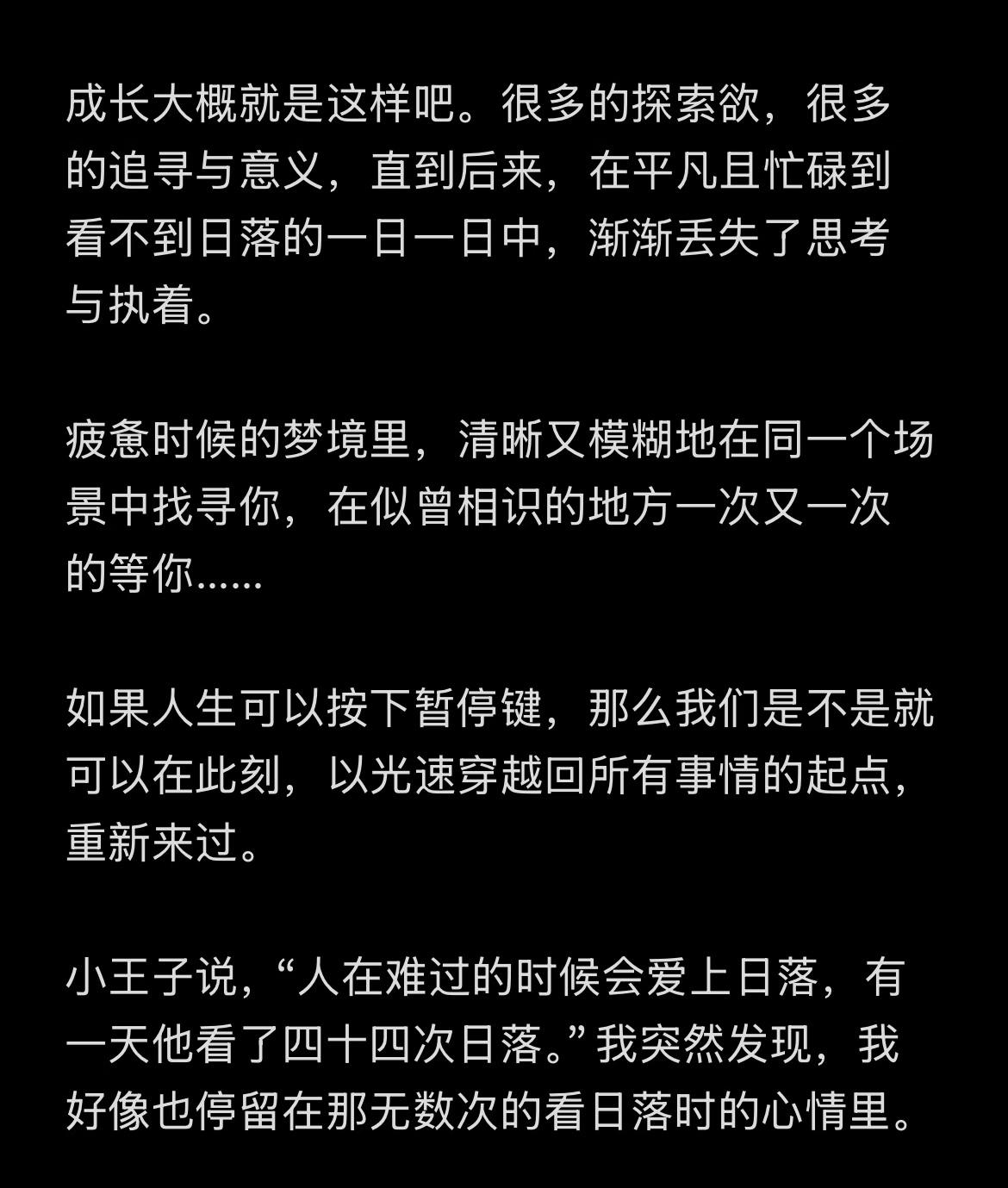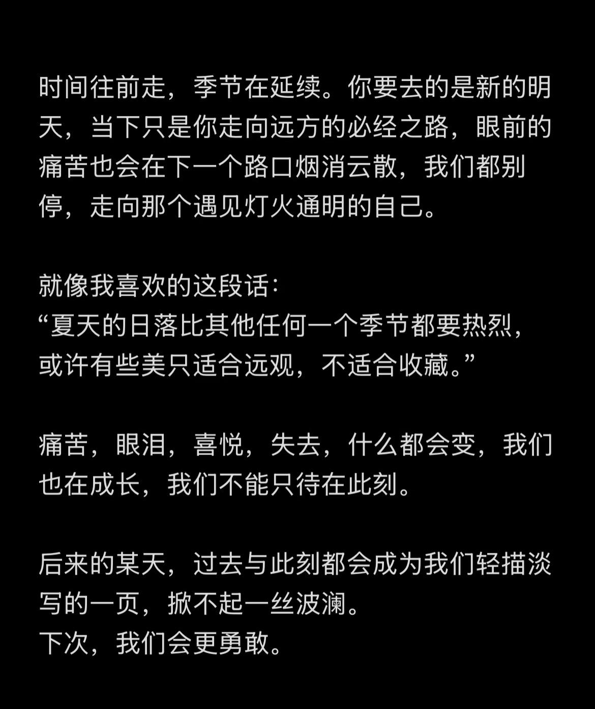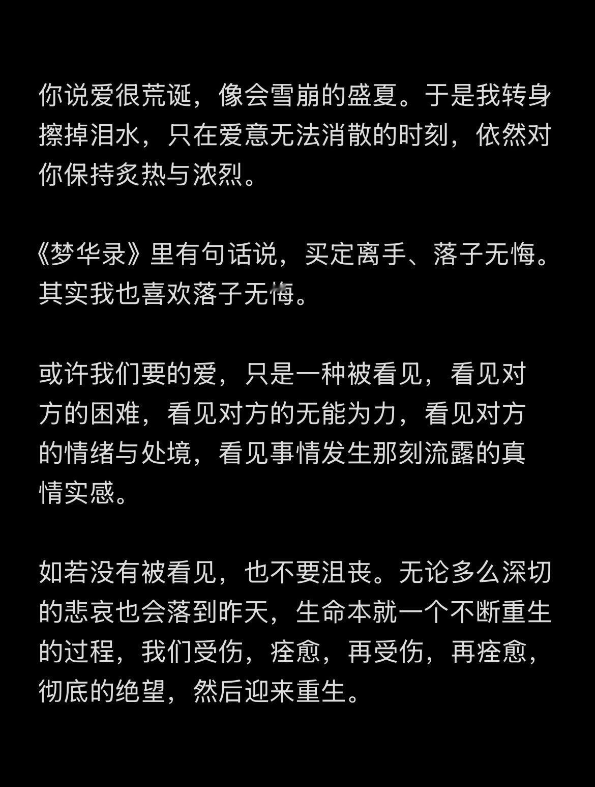 人不能总是待在自己的命运里痛哭 浪漫生活的记录者 Mr.Y 看到一段很喜欢的话,博主这样写道: “我在我的二十岁,尽情地花时间思考爱和欲望,问自己到底想要怎样的人生? 可是我又明白,过于执迷于答案也是一种歇斯底里。人不能总是待在自己的命运里痛哭。 枯萎、凋零、再重新长出来,这个世界上所有生物就是这样活着的。” 我也曾有过这样的时刻,执着于为什么,想从你那里要一个答案,想要弄清楚该拥有怎样的人生。 人生不过是一场自我救赎 心情 情书 小红书原创随笔 原创文字 每一种爱都值得被看见 爱情 我被文字打动