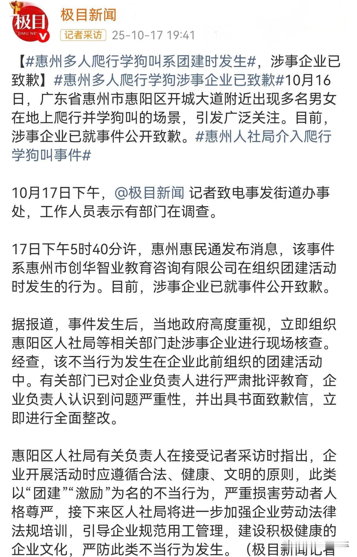 惠州街头员工爬行学狗叫事件。迎来了官方的回答。 25年10月16日中午,广东惠州惠阳区开城大道大润发超市门口,约10余名男女集体四肢着地爬行并模仿狗叫声,持续约15分钟,可恶的是现场还有专人监督拍照。根据媒体调查这是惠州市创华智业教育咨询有限公司组织的突破自我、激励团队团建活动。10月17日,企业发布书面致歉信,承认行为严重不当,承诺停止此类团建并全面整改。 而惠阳区人社局则是定性为,该企业行为严重损害劳动者人格尊严,仅对企业负责人严肃批评教育。当地街道办社区,对企业行为认定是要注意方式方法,禁止挑战公序良俗。警方也表态因无人报警且无直接胁迫证据,暂未立案,但声明若涉强迫立即介入。 谁不是父母的儿女,谁又不是为了碎银几两才忍受资本的压迫,成年人谁不要面子?在车来车往的路边丢光尊严,都是被生活或工作逼到了份上。我敢说这些在路面上爬行学狗叫的人,但凡有点家庭背景的人会如此作贱自己吗?更让人叹息的是《民法典》第109条(人格尊严保护)及《劳动法》第96条(禁止侮辱体罚劳动者),若查实为企业强制,可追究刑责。这个事件中工会在哪里?公理何在! 员工不是工具人,企业管理的底线是法律。企业打着员工抗压能力训练的幌子,将人格践踏为奴性,这就是管理无能的表现。它不是什么励志的体现,更不是什么流量密码,而是一种丑陋的、病态的行为表现。明明就有法律规定,可该负责这些问题的部门却如此冷漠😒此事件暴露的不仅是一家企业的失范,更是监管部门的短板。打工人为了生存不该放弃尊严为代价,否则笑贫不笑娼的问题,就会变成社会上现实。