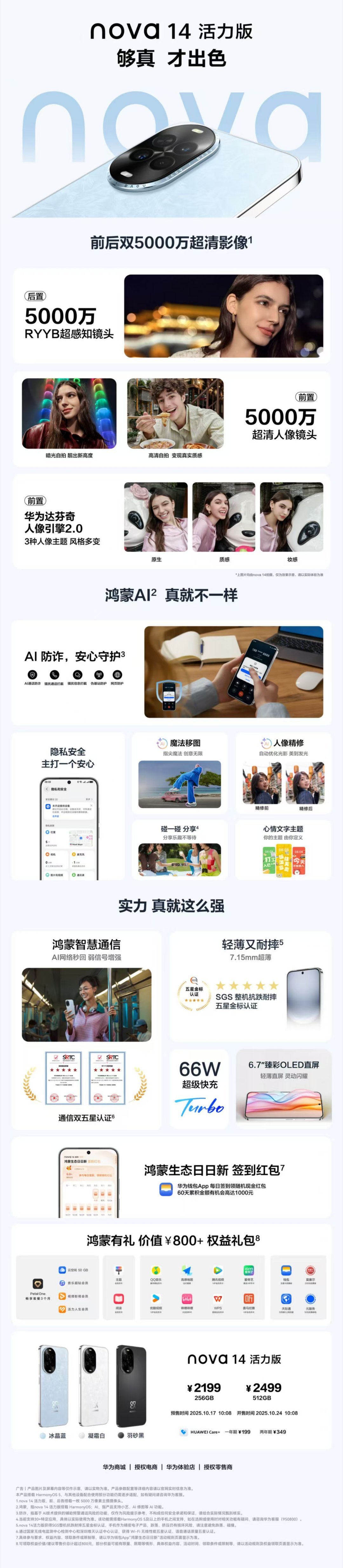 而同步开启预售的华为nova 14活力版定位中端5G市场,采用6.7英寸OLED直屏(2412×1084分辨率,120Hz刷新率),搭载麒麟8000A处理器与鸿蒙OS 5.0系统。影像方面配备前置5000万像素镜头及后置5000万RYYB主摄+800万超广角双摄,内置5500mAh电池并支持66W快充。新机提供冰晶蓝、凝霜白、羽砂黑三款配色,256GB版售价2199元,512GB版为2499元,延续了nova系列“年轻科技潮流”的定位。