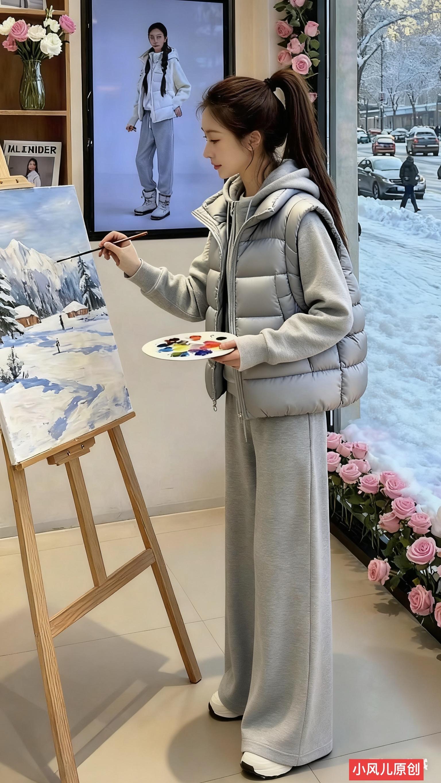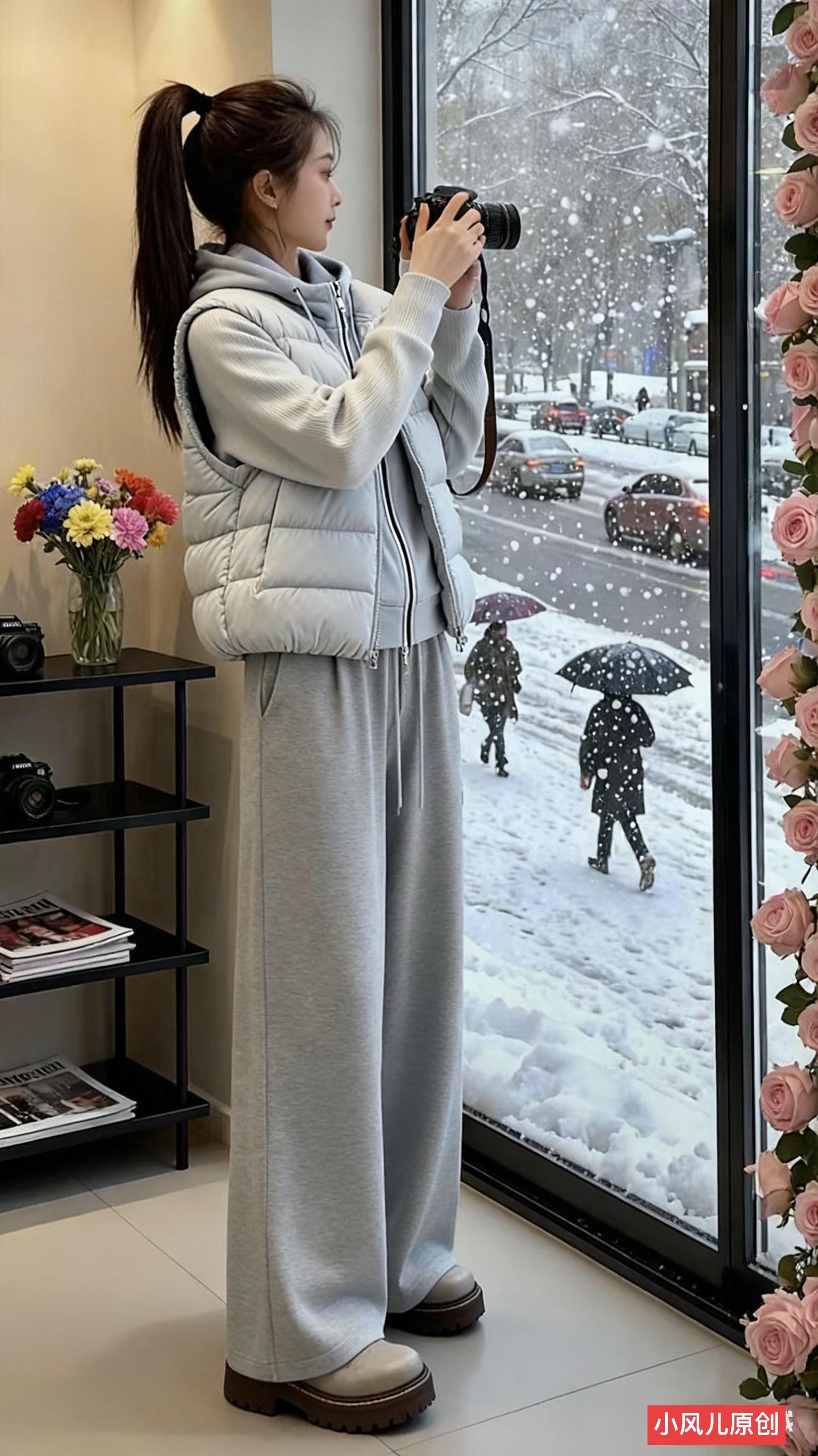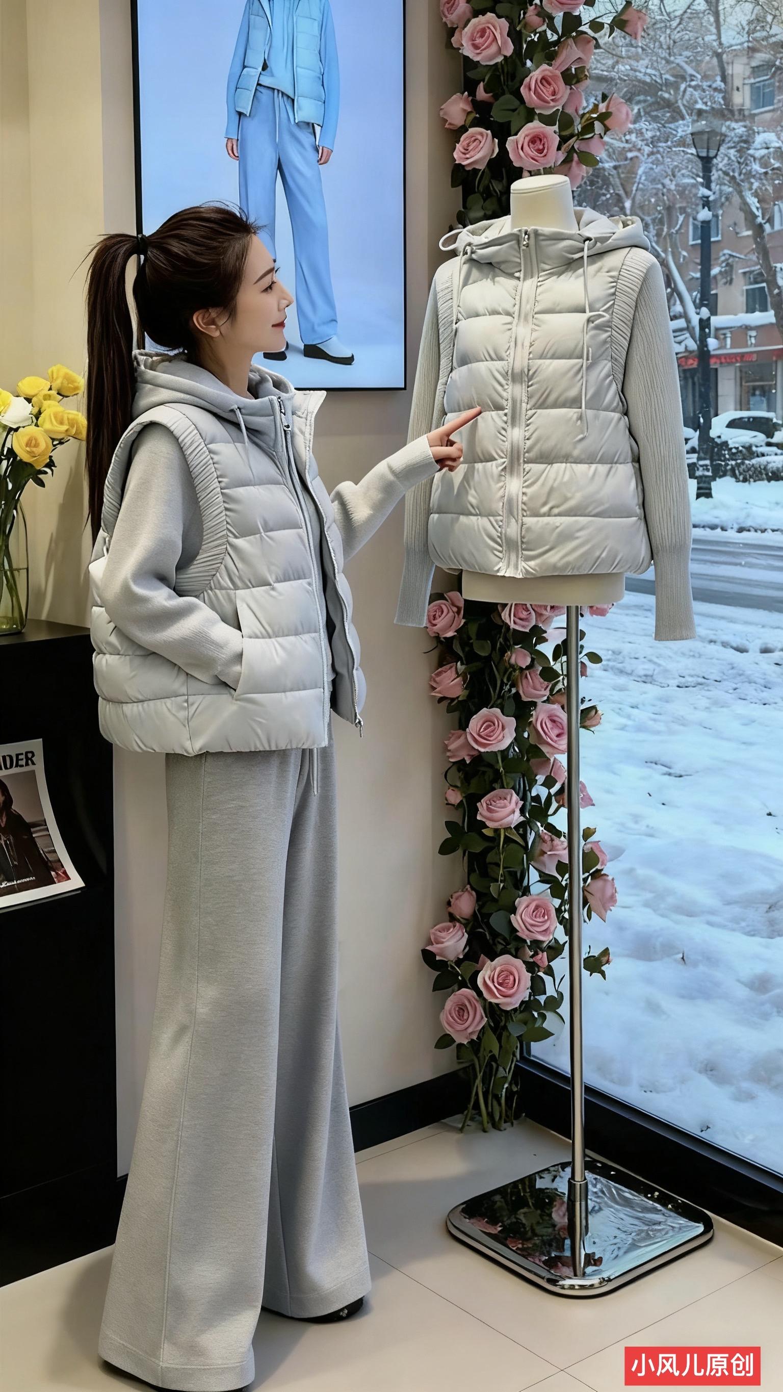冬季高档套装三件套。窗外覆雪,店内挂衣区衬出穿搭氛围; 人物自信舒展...