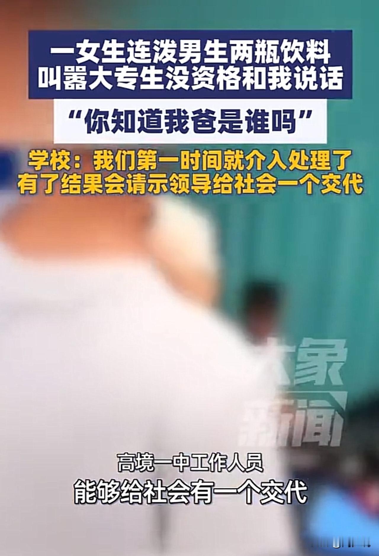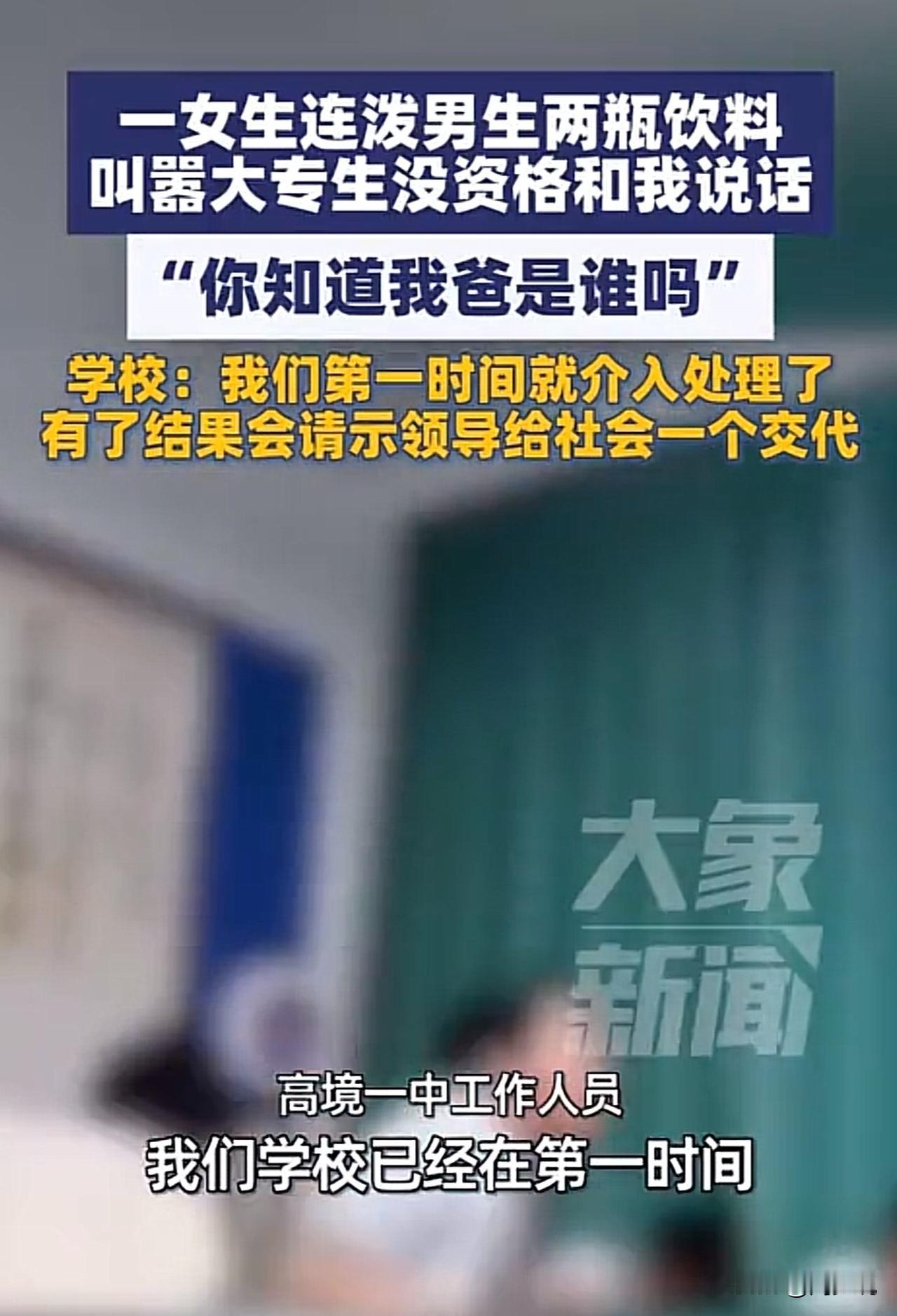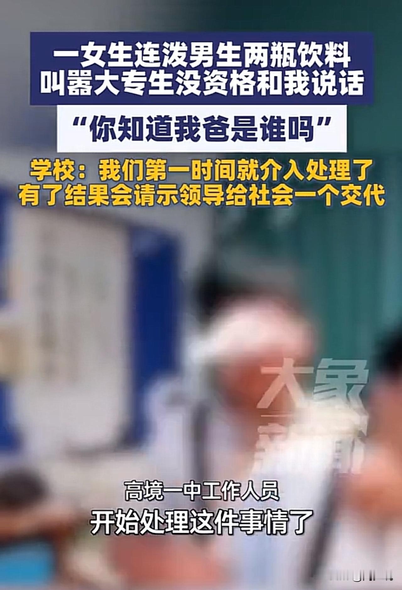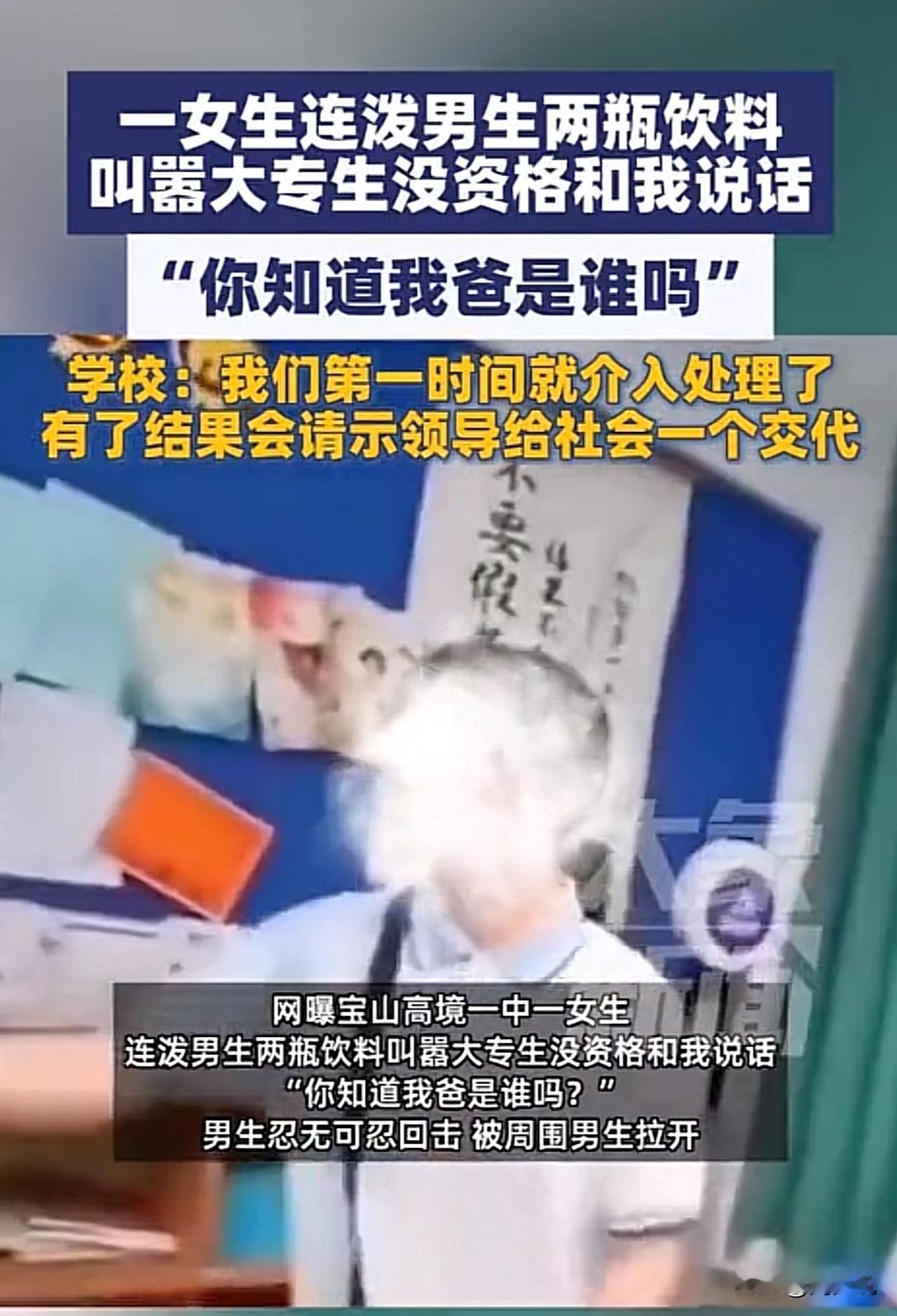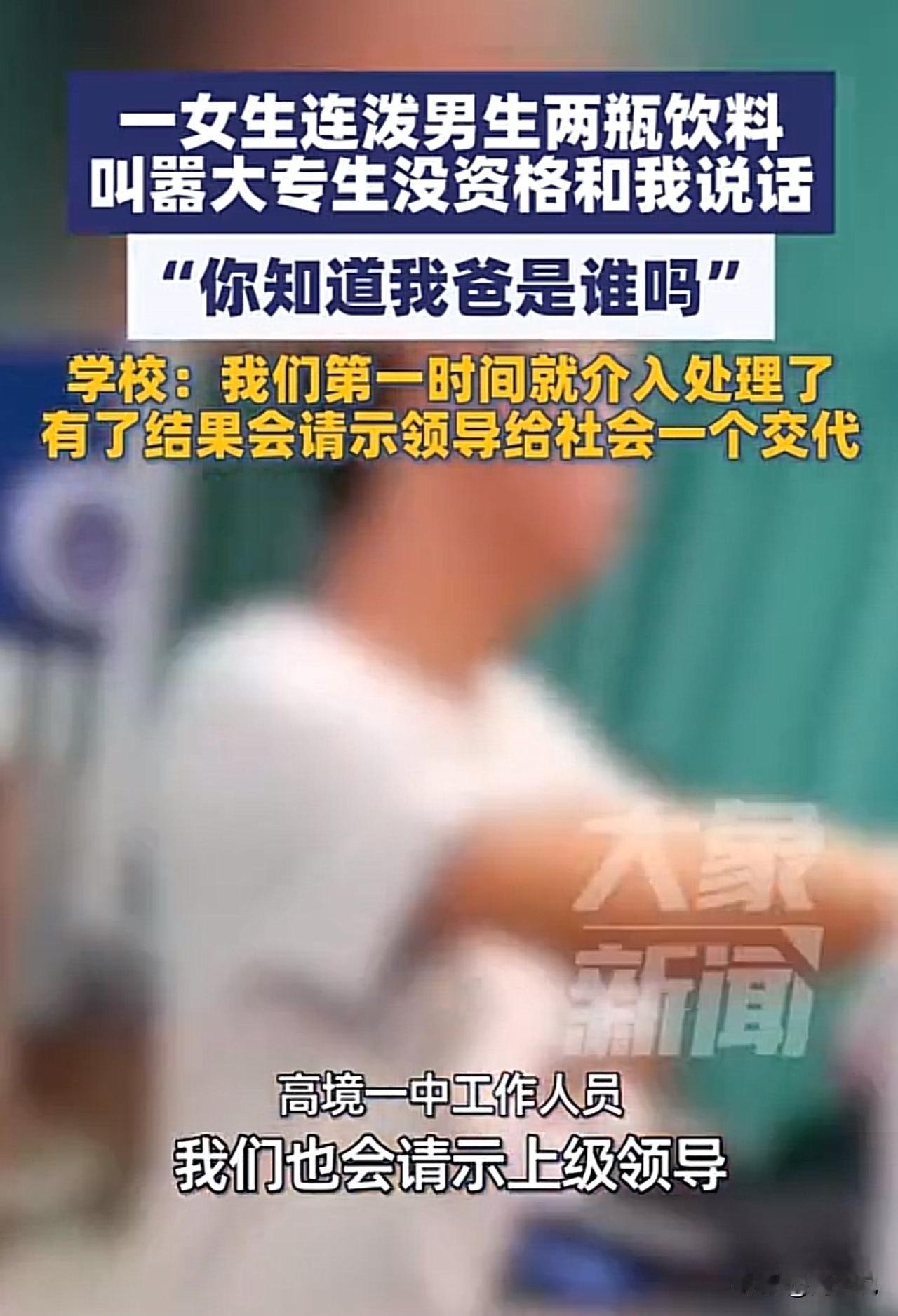 #男生被泼饮料后遭同学呵斥 学校回应#太嚣张了!一位女生当众羞辱同学:“中考比我低三十分,大专生没资格和我说话!” 上海高境一中教室内,一名女生拿起饮料瓶,直接泼向男同学。第一瓶泼完还不解气,骂道:“中考比我低三十分,大专生没资格和我说话!”随后又拿起第二瓶猛灌,并嚣张威胁:“你知道我爸干什么的?” 此视频曝光后,不少网友纷纷表示,“通过现象看本质,女孩泼完一瓶饮料又大大咧咧的打开第二瓶泼,是严重对男生人格侮辱,后面拉偏架男生的架式就是为女生助威,这种行为必须严惩,给受害者一个交代!” 还有网友更是坦言,“看动作,男孩子感觉练过!一开始忍着,女孩子一再霸凌,只能反击,应该属于正当防卫!” 针对此情况,学校回应称,“已第一时间介入处理,结果出来后会请示领导,并向社会公布。” 在周少看来,这件事反映出校园教育中人格尊重和法治意识的缺失。成绩与家庭背景不该成为欺凌的资本,学校处理时应注重惩戒与教育并重,同时加强反霸凌机制,培养学生的同理心与包容性。 对于男生被泼饮料后遭同学呵斥,大家怎么看呢?#寻美三湘# #长沙新朋友#
