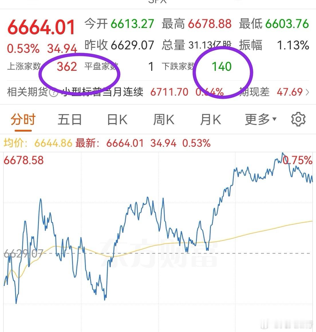 昨晚没啥消息,美股小涨,但标普500涨多跌少,有362家是涨的,红绿比7.5:2.5。