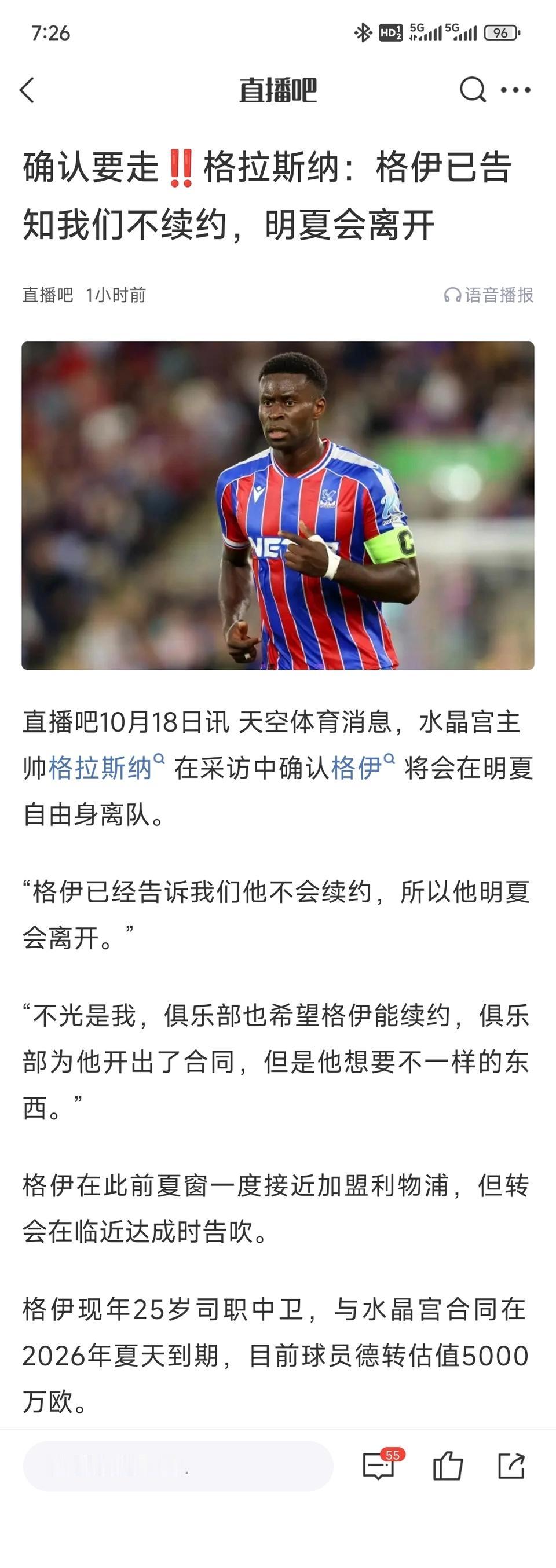 格伊再次告诉水晶宫不续约。 这还用问,全世界都知道了,导致很多豪门都想免签格伊