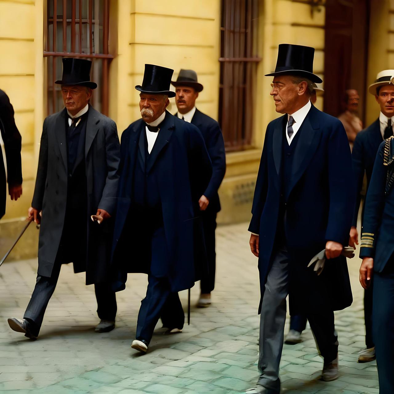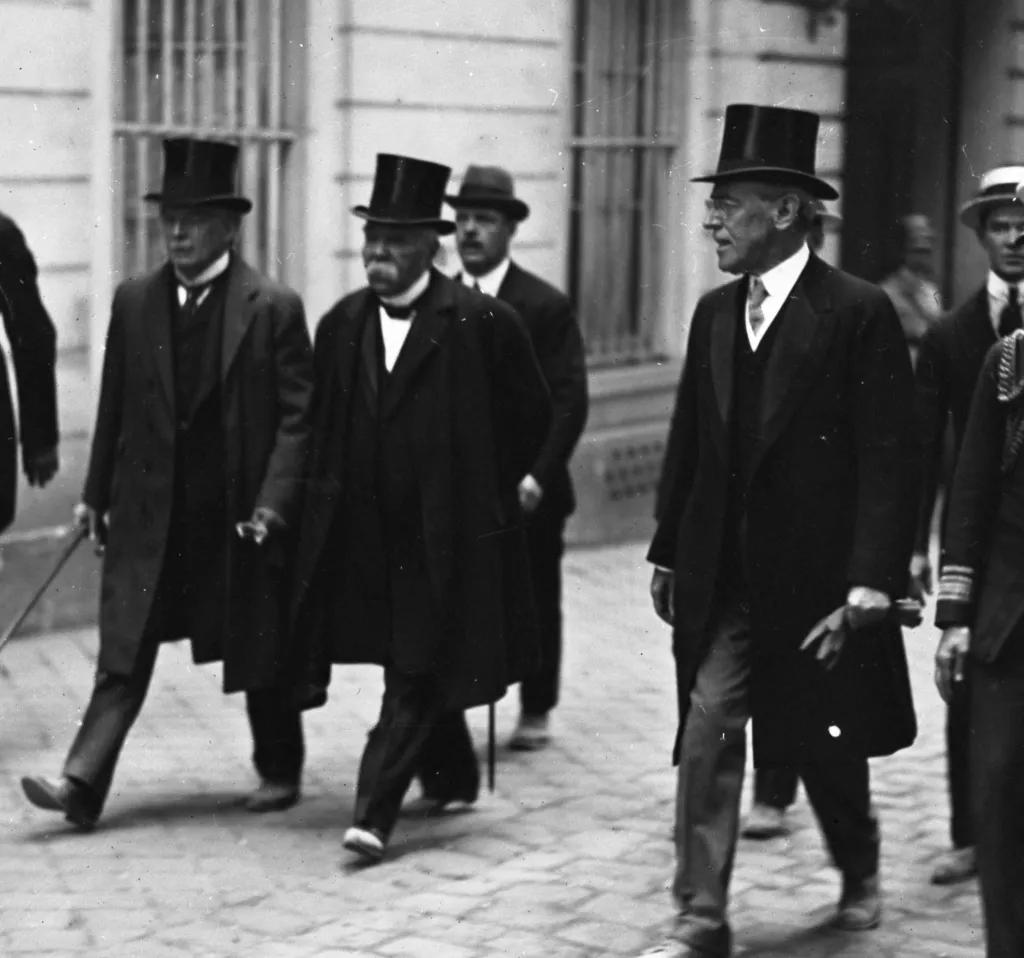 这张照片定格了巴黎和会“三巨头”的权力群像,画面中从左至右依次是英国首相大卫·劳合·乔治、法国总理乔治·克里孟梭、美国总统伍德罗·威尔逊,他们是1919年巴黎和会的实际操控者,正行走在巴黎的砖石街道上,每一步都牵动着战后世界秩序的走向。 劳合·乔治的从容周旋、克里孟梭的强势外露、威尔逊的理想主义式坚定,在这张黑白影像中凝结成帝国主义强权政治的缩影——他们身着光鲜礼服,却在凡尔赛宫的谈判桌上,以“和平”之名完成了对殖民地、战争赔款的分赃,也为二战的爆发埋下了伏笔。