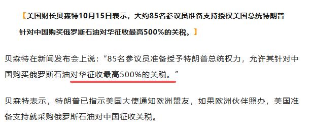 要让其灭亡,必先令其疯狂! 就在今日清晨,美国财长贝森特咬牙切齿地发誓,他已联络了数十名美国参议院议员,打算授予特朗普对中国加税500%。 说到底,贝森特搞出这么大动静,其实背后推手还是美国这场内部权力博弈,表面上说是为了“国家利益”发声,但明眼人都清楚,几个月前特朗普跟他的145%加税案现在正闹到最高法院,合不合法还两说呢,这500%的新招数就是帮特朗普找条后路。 参议院出面包装一下,就算之前的关税搞不成,也能硬着头皮继续施压中国,整个过程更像是在拯救政治颜面,不是真心想解决什么贸易问题。 美国对中国加税的说辞,像是“中国买俄罗斯石油影响到美国”,说得那么高大上,但实际上一查才知道,拜登政府去年自己还偷偷买了不少俄罗斯能源,这种左右都能说得通的思路,让外人看来只能摇头。 美国在对外喊口号“维护规则”的同时,自家的232条款早被最高法院打成了不合规,这回又绕过法律走捷径,反映出他们在国际规则和国内法治面前都缺乏诚意,就是想随便换个理由打压中国,说白了就是双重标准。 加税的可笑程度还不止于此,华尔街的专业人士当场挑明,500%不是经济手段,是走极端的表演,想想也是,美国一年从中国进口五千多亿美元,一旦新关税真推下去,美国百姓才是大头亏,一年多掏2.5万亿美元。 这些钱不会凭空冒出来,全部都要从美国普通家庭里抠出来,贝森特显然低估了美国人的耐受力,假装这些成本能化掉,其实到头来谁也逃不了买单。 贝森特一边打中国,一边拉着墨西哥、加拿大等所谓的“亲密盟友”一起上,承诺谁站队早谁拿优惠,可墨西哥真跟着美国加税,马上自家经济先动荡,商界怨声载道;加拿大则怒得撤了美国债,自己都不愿意继续被玩弄。 这种威逼利诱的老套做法,现在国际社会早看明白了,美国的影响力正在被削弱。 从头到尾,这场五百个百分点的加税大戏,展示的就是美国面对中国越来越强大后的焦虑感,过去横行无阻,现在突然发现中国不但没被拖垮,还越挫越强。 美国一时没招了,就摆出个狠招自我安慰,可真正的大国较量拼的不是谁加税高,谁玩套路多,而是比谁的经济扎实、科创能力强、市场有韧性,靠加税这种伤人伤己的傻招数,不但解决不了问题,只会让自己衰退得更快。 中国不是软柿子,不会轻易服软也不会被随意拿捏。越是面对压力,越会逼出中国隐藏的韧劲和创新力,美国如果还沉浸在加税的旧把戏里,只会让霸权走向尽头。 参考信源:美国财长:美参议院准备授予特朗普对华征收最高500%关税的权力——俄罗斯通讯社