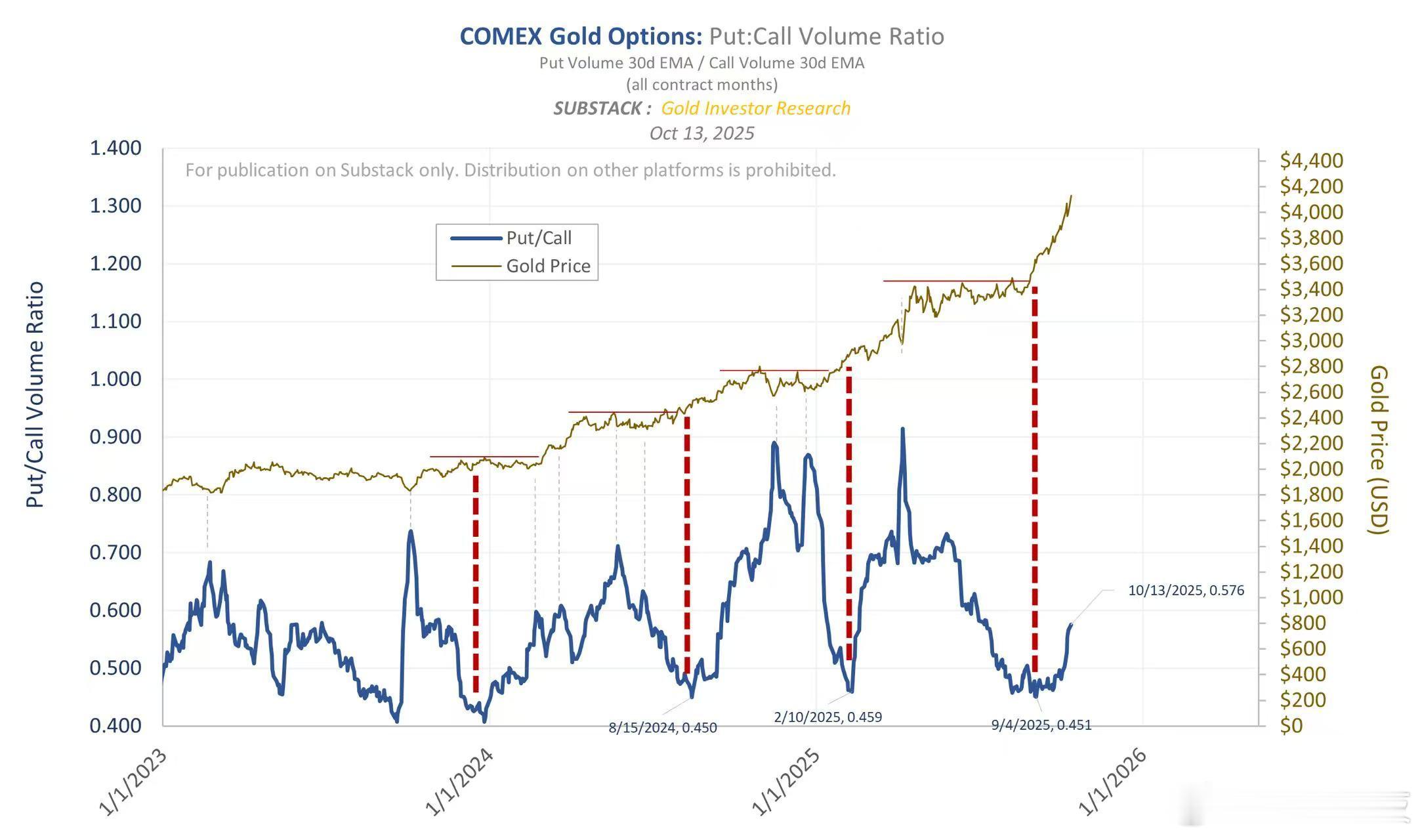 以图3来分析,黄金的价格不是和局势相关,蓝色线是黄金的看跌期权与看涨期权的比例,蓝色线最低点是市场黄金看跌期权相对看涨期权比例,很低的时候。也可以说,市场上更多人在买黄金看涨。