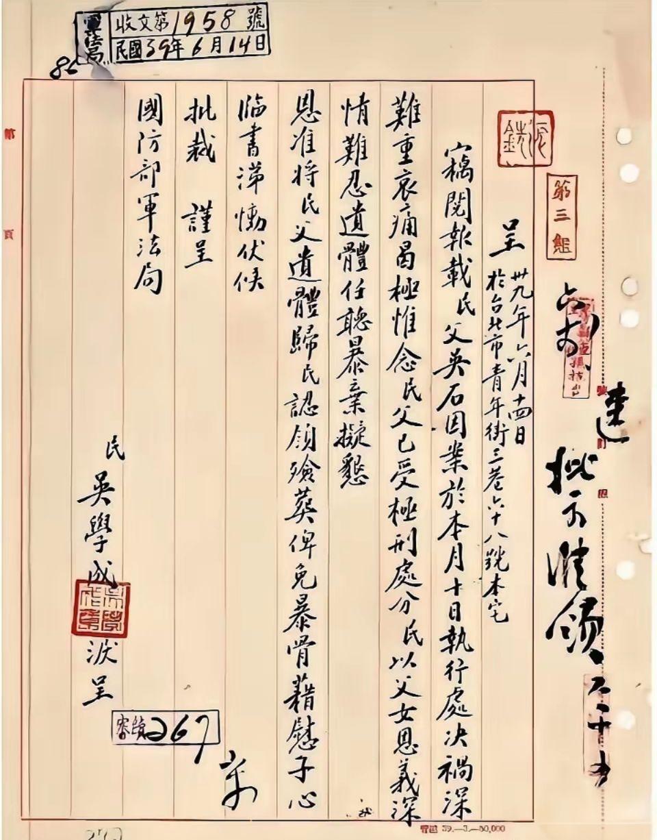 黎明之后,依然有人奋斗! 吴石将军的女儿,写信要回父亲的遗体,不让其暴骨于外,安息于一棺之间。信中情真意切,章法有度,笔力遒劲,感人至深。 民国39年,应该是1950年,距今已有75年,75年之后,国家强大,足以告慰先烈。 我们能做什么呢? 只能在自己的岗位上好好工作学习,珍惜来之不易的强盛与幸福。