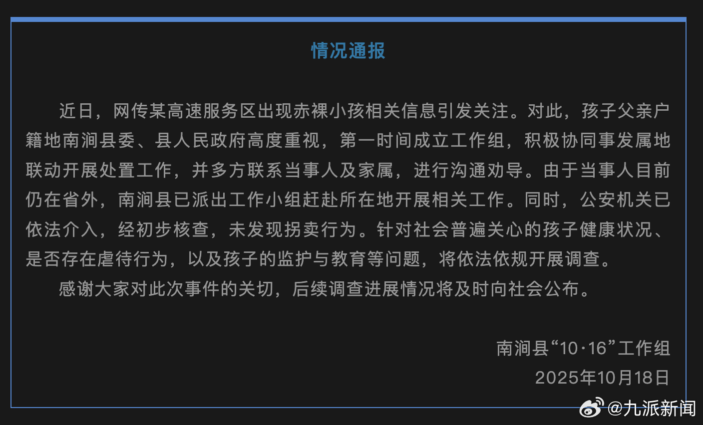 【#官方通报高速服务区现赤裸小孩#】近日,网传某高速服务区出现赤裸小孩相关信息引发关注。对此,孩子父亲户籍地南涧县委、县人民政府高度重视,第一时间成立工作组,积极协同事发属地联动开展处置工作,并多方联系当事人及家属,进行沟通劝导。由于当事人目前仍在省外,南涧县已派出工作小组赶赴所在地开展相关工作。同时,公安机关已依法介入,经初步核查,未发现拐卖行为。针对社会普遍关心的孩子健康状况、是否存在虐待行为,以及孩子的监护与教育等问题,将依法依规开展调查。 感谢大家对此次事件的关切,后续调查进展情况将及时向社会公布。