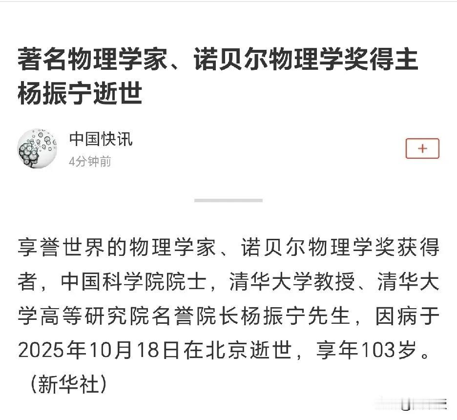 杨振宁先生逝世[祈祷][祈祷][祈祷] 先生千古[祈祷] 杨振宁教授是20世纪最伟大的物理学家之一,贡献横跨粒子物理、统计力学等多领域。他与李政道提出弱相互作用中宇称不守恒,打破物理界固有认知,获1957年诺贝尔奖。更核心的是创立“杨-米尔斯规范场论”,为电弱统一、量子色动力学等现代物理理论奠基。此外,“杨-巴克斯特方程”等成果也深刻影响物理与数学。晚年他归国推动科研教育,是连接中外学术的桥梁[赞][祈祷]