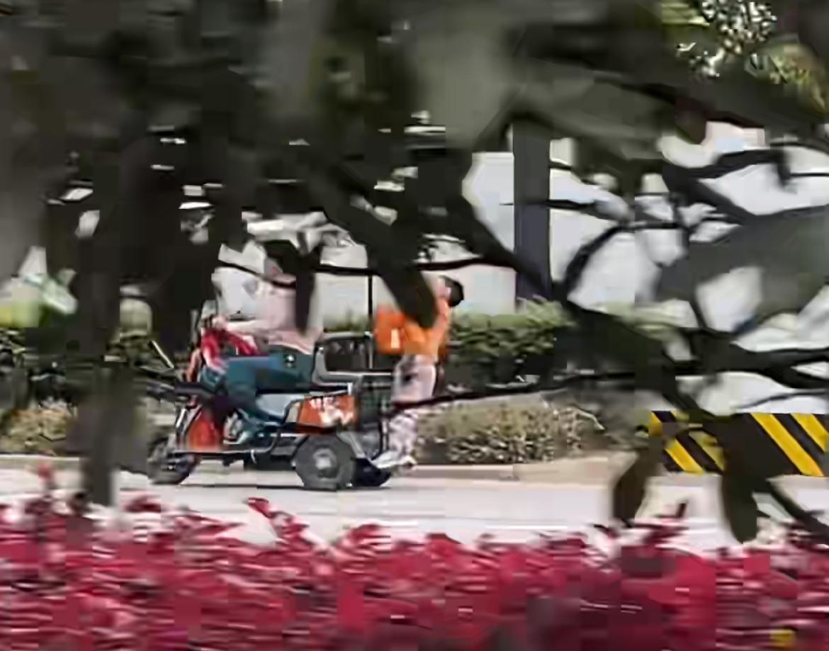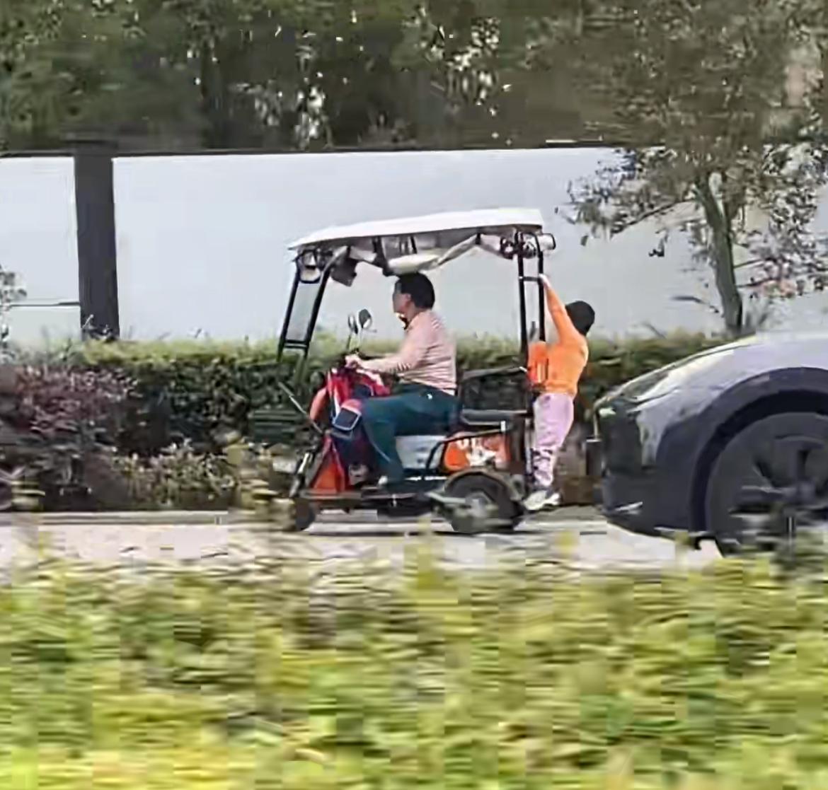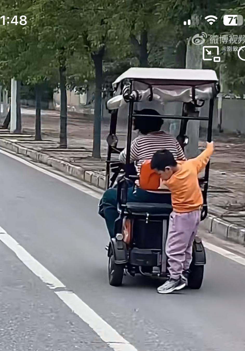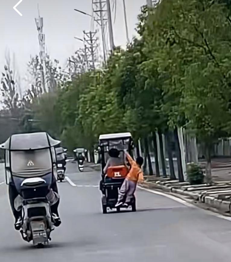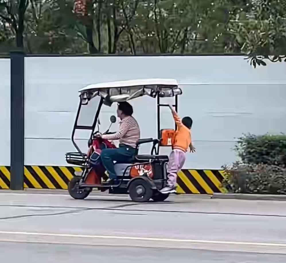 马路上看到的惊险一幕,奶奶骑着三轮电瓶车飞驰,孙子趴在后背玩杂技,就是这样纵容孙